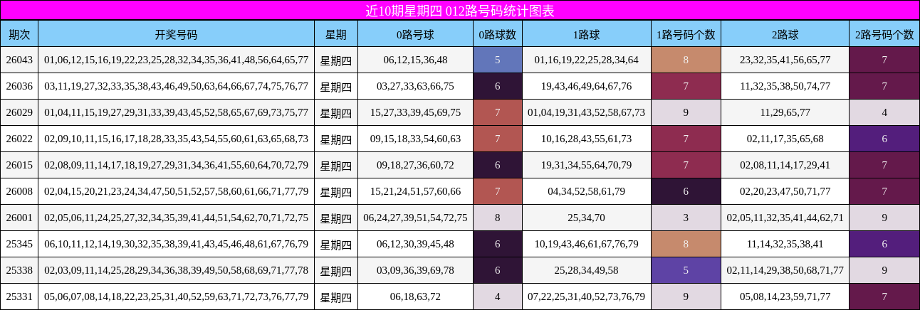 下图展示了近10期星期四012路号码的分布情况,直观反映各路走势。