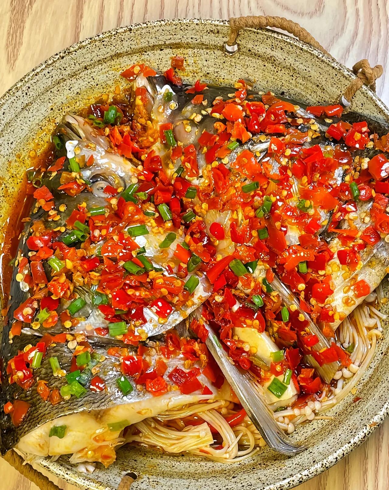蒸好的鱼头端出来,撒上葱花。最后一步是点睛之笔:烧两勺热油,烧到微微冒烟,"滋啦"一声淋在鱼头上。高温激发出葱花和剁椒的香气,整道菜瞬间活了起来,红亮亮的色泽让人食欲大开。