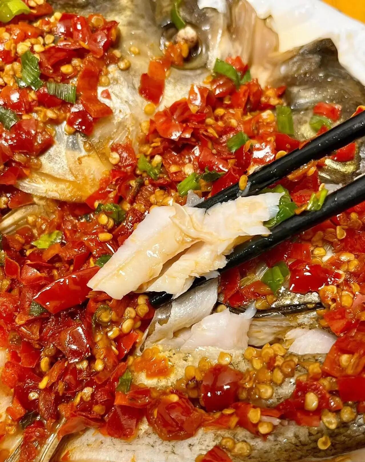 吃剁椒鱼头可是个技术活。先夹鱼脸肉,那是精华中的精华,嫩滑得像豆腐;再啃鱼眼周围的胶质,黏糊糊的满满的胶原蛋白;最后别忘了鱼脑,虽然看着像豆腐脑,但鲜美得很,用筷子轻轻一吸就滑进嘴里。
