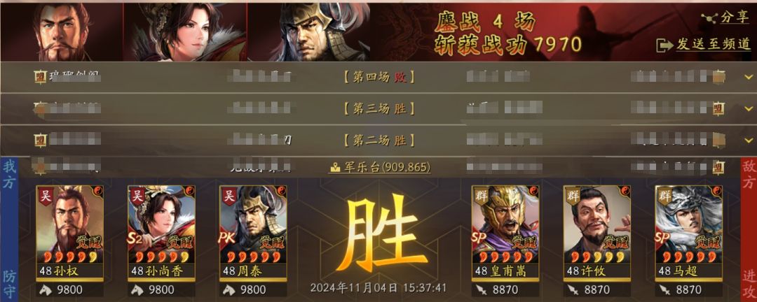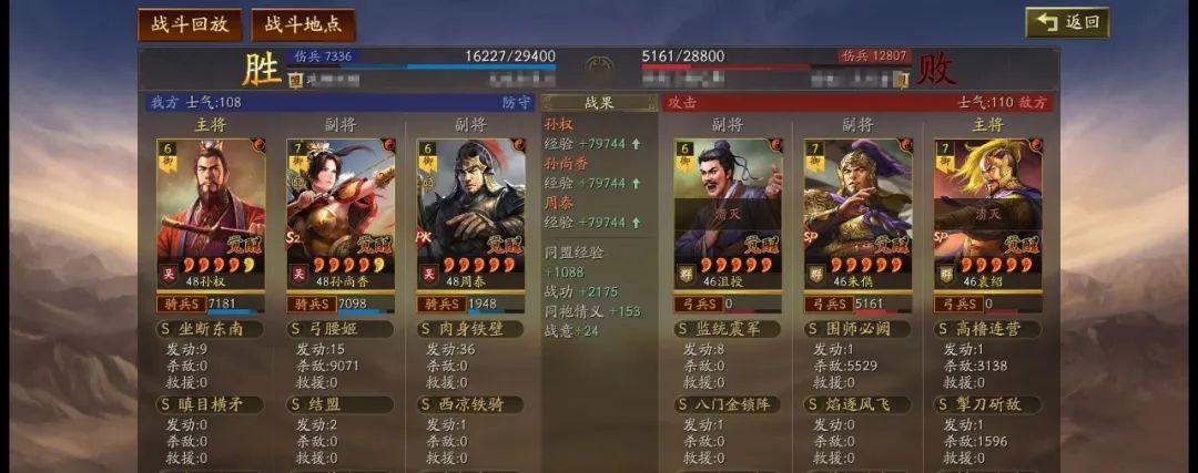 这个阵容就看三个战法就行了,结盟和临锋决敌的发动次数,弓腰姬的触发和坐断东南的触发。