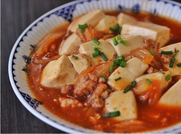 材料: 泡菜一小碗、猪绞肉100克、豆腐一块、蒜末一勺、葱花一勺、料酒一勺、生抽3大勺、糖小半勺、胡椒粉少许、水淀粉适量;