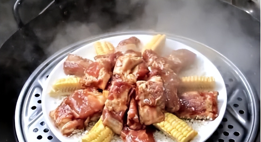 4、开始蒸玉米排骨,锅内烧水,放好篦子,把排骨放到篦子上,盖严实盖子,把水烧开后,把排骨放入锅中,盖上锅盖转中火蒸30分钟。时间到以后,所有食材都已经蒸熟,蒸入味,排骨软嫩解馋,玉米香软可口,把它在锅中取出,放上少许香菜点缀即可上桌食用。
