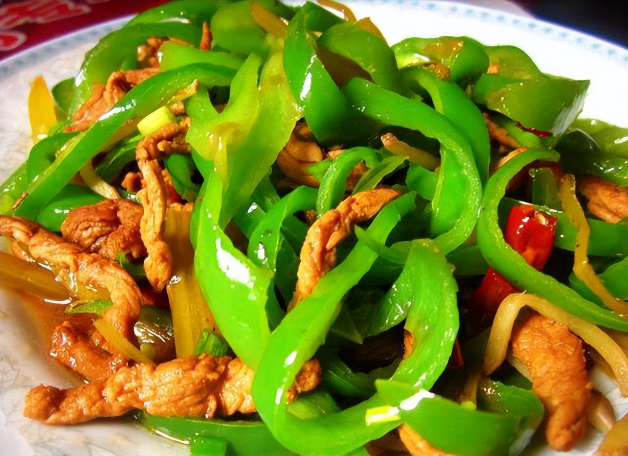 5.加入青椒丝和适量的芡水继续翻炒2分钟,淋适量香油