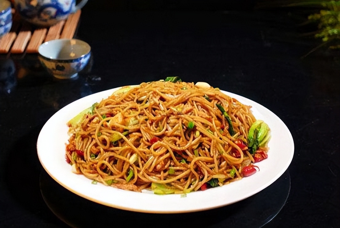 3.加入饼的丝,倒入老抽,翻炒均匀后倒入适量开水,炒至水被均匀吸收即可