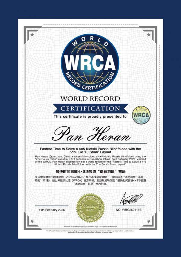 2026年2月6日,泉州7岁男孩潘赫然,在泉州WRCA世界纪录官方认证的挑战现场,迎来了万众瞩目的高光时刻——在WRCA益智类项目认证官50项世界纪录获得者叶佳希老师、中明大魔方大湾区负责人陈伟老师、中国魔方一级裁判员黄玉梅老师等专业团队的共同见证下,他使用魔域文化三国华容道,以1.37秒的极致速度,大幅度打破最快时间盲解4×5华容道“诸葛羽扇”布局的WRCA世界纪录!
