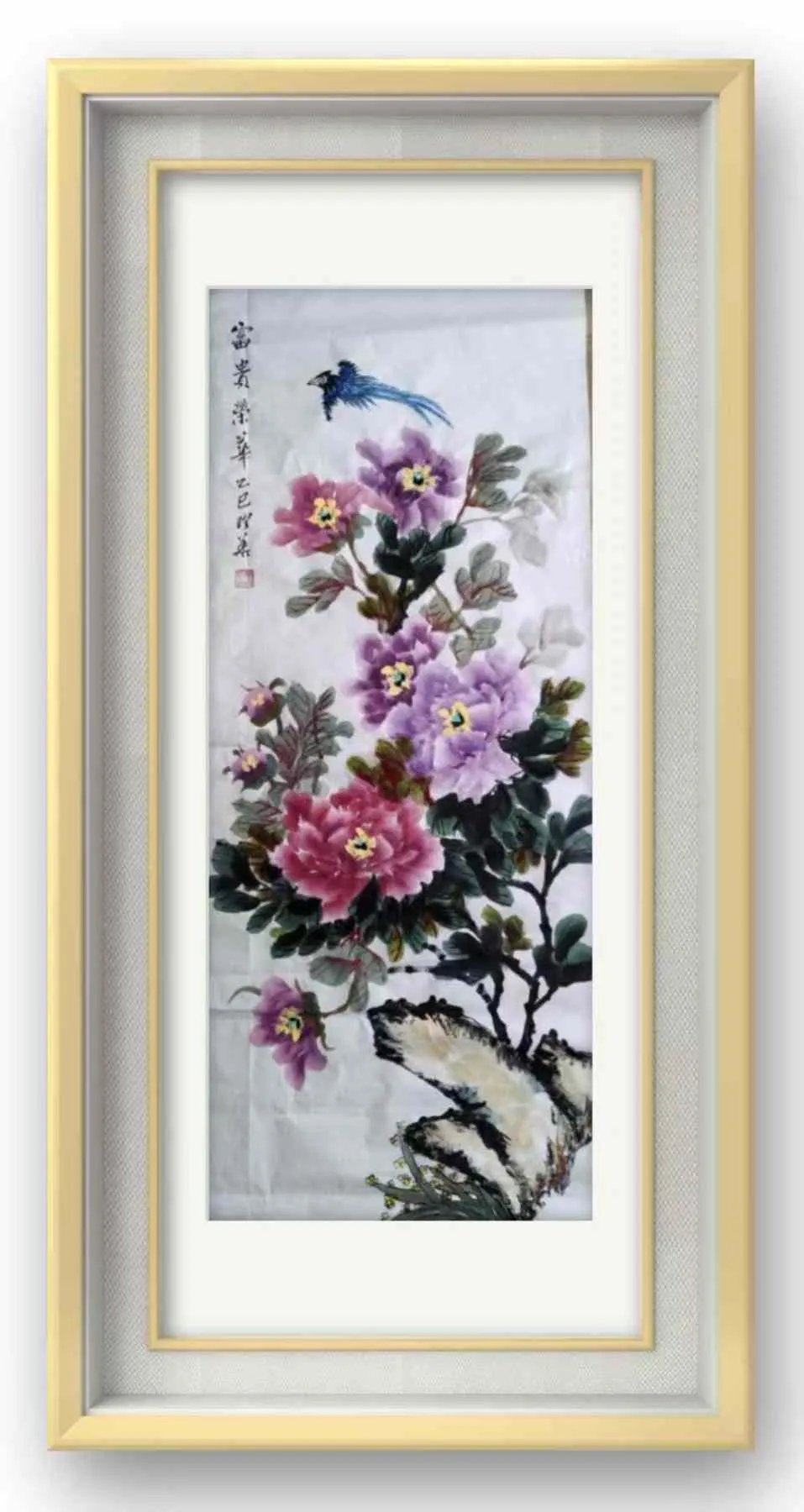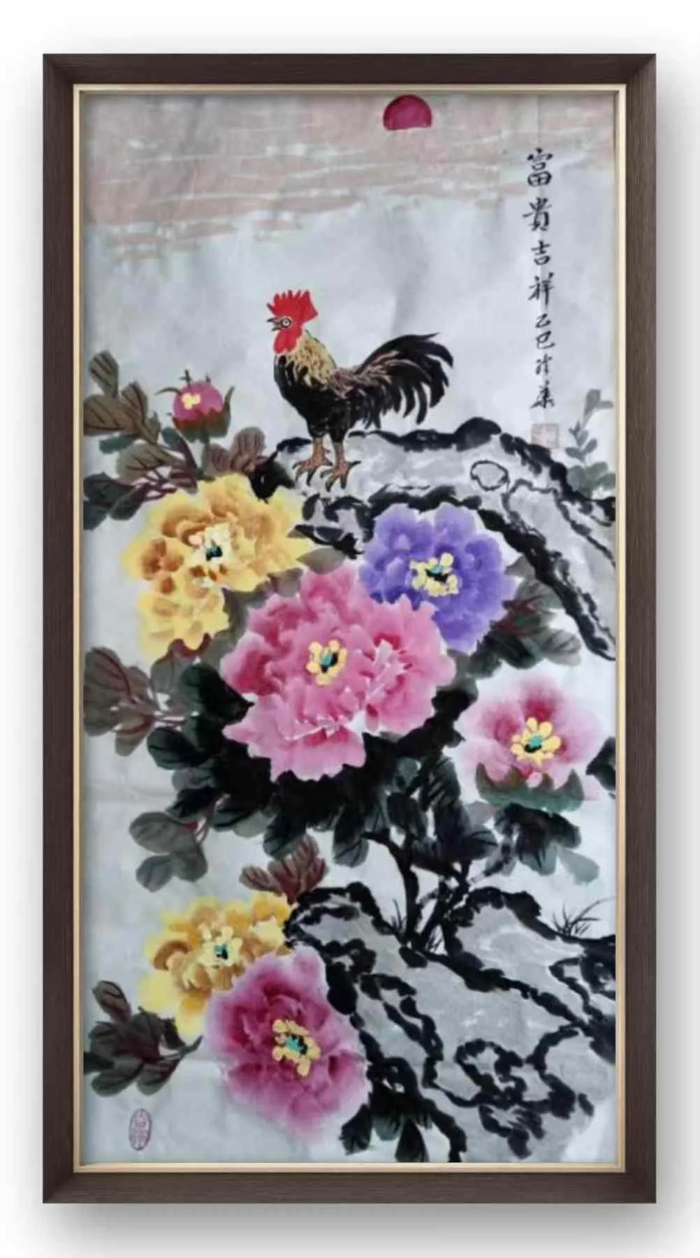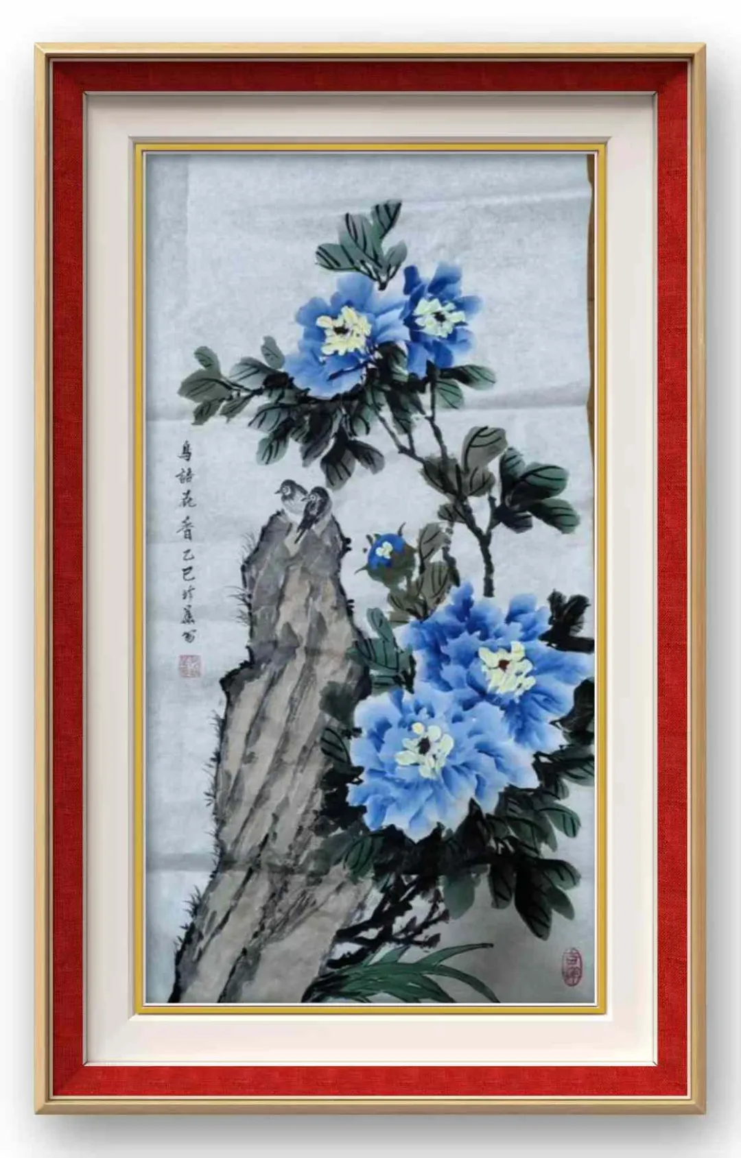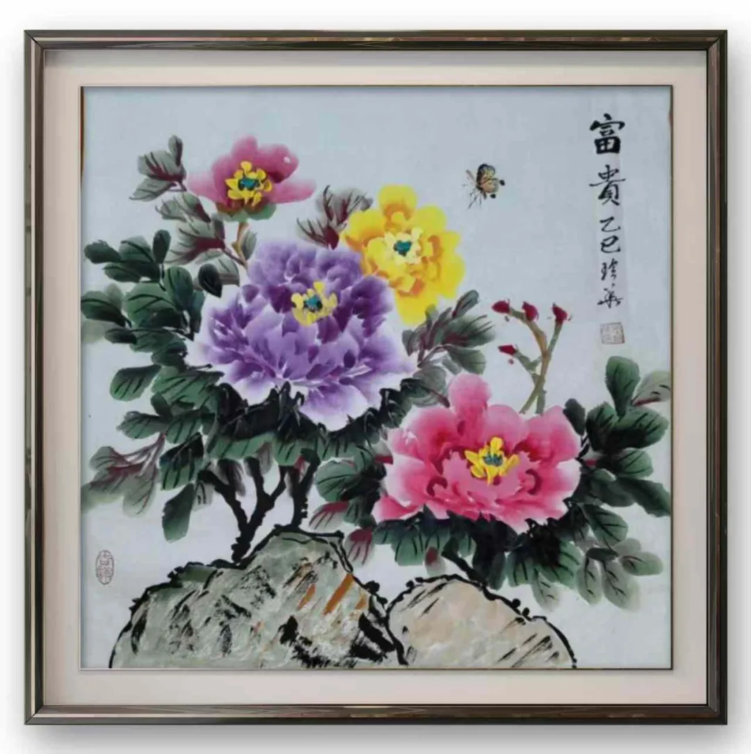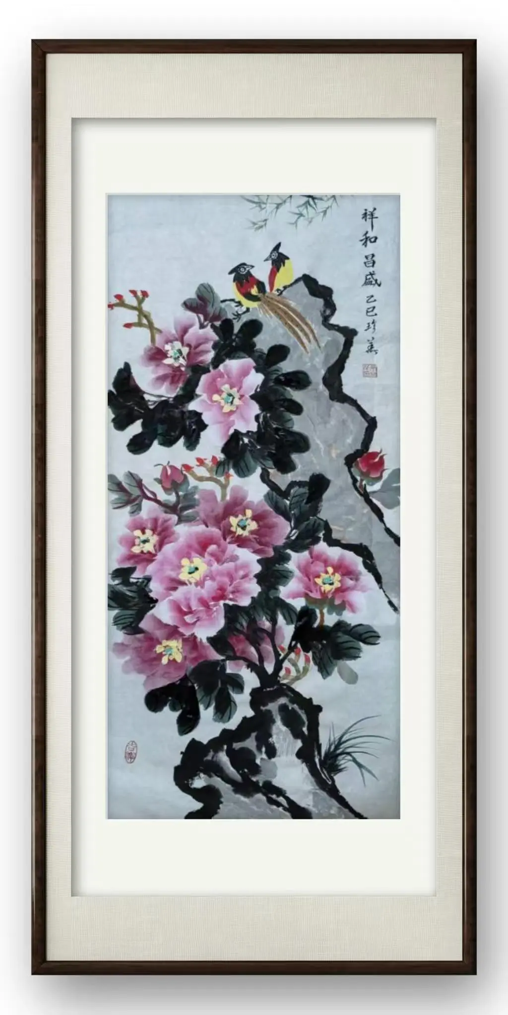其牡丹作品不仅是视觉的享受,更是精神的寄托。2025年"献礼两会"金奖作品《盛世华章》中,牡丹与竹石相伴,寓意"富贵有节"。作品通过构图与意境的营造,将个人情感与时代精神相融合,展现出"花鸟寄情"的文人传统。
