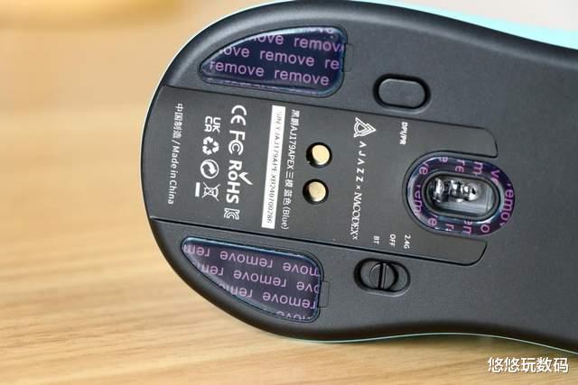 黑爵AJ179 APEX底部相对其他的无线鼠标多了2个磁吸充电金属触点,但少了一个无线收发器的收纳仓,这也是这款鼠标的独特之处,用充电底座代替了无线收发器。同时底部还有模式切换键和DPI/PR切换键,将DPI/PR切换键设计在鼠标底部(一般都在滚轮旁)也是一个小细节,能有效防止游戏时误触。