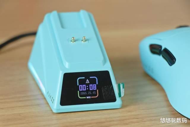 黑爵AJ179 APEX标配了彩屏磁吸充电座,相信很多老玩家也是第一次见这个东西,充电座内置8K接收器,并且彩屏支持GIF动图、时间、电量、调参显示等。