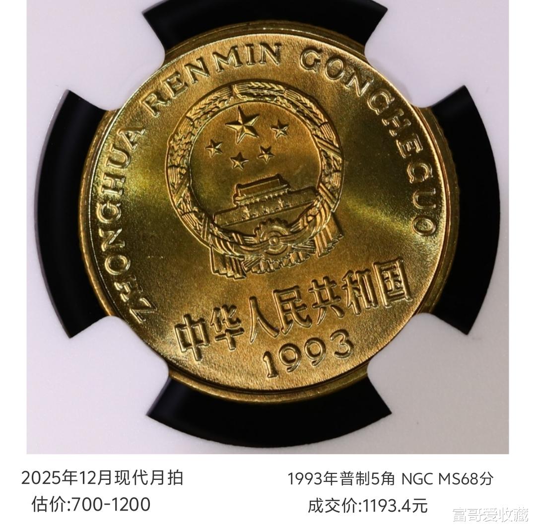 一枚NGC评级MS68分的1993年“普制5角”,估价达到1200,最后拍出了1193.4元。