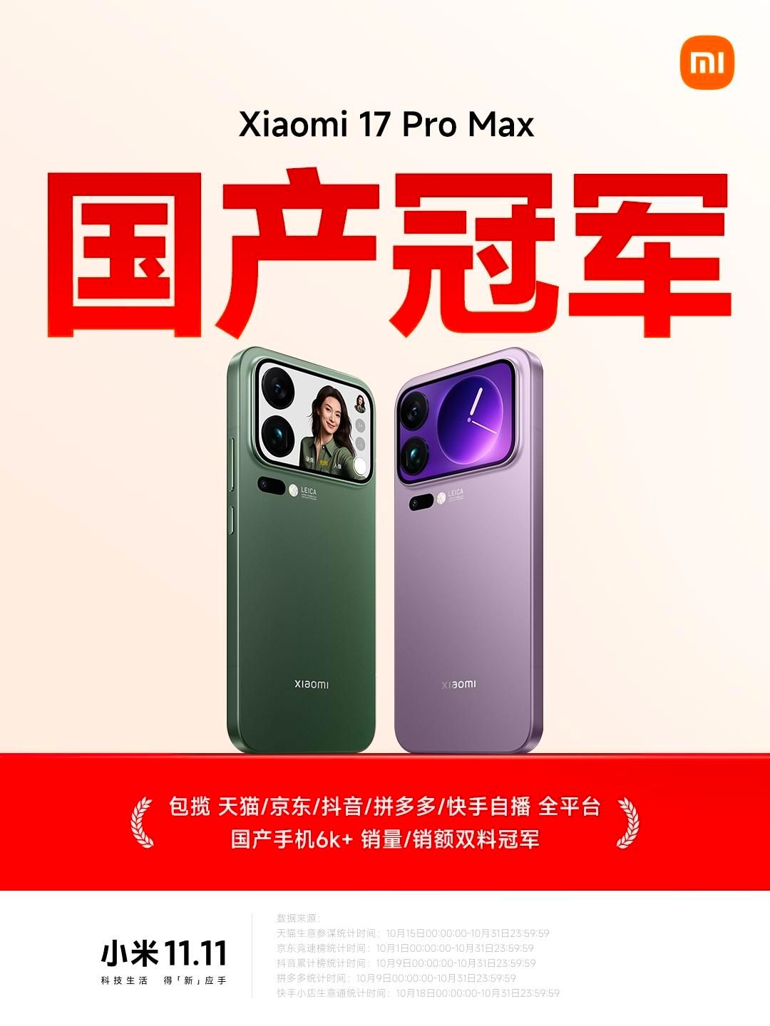 另外在手机的销量中,小米在每年的双十一大促中都是国产手机的销量冠军,而今年也是如此,不仅包揽天猫、京东、抖音、拼多多、快手全平台国产手机销量第一。同时小米 17 ProMax 还一度成国产 6K+价位段销量销额双第一,他的市场表现堪称 “高端破局典范”。