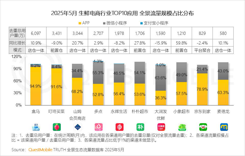 同据 QuestMobile,2025 年 5 月,盒马与叮咚买菜、山姆会员商店 App 徘徊用户数较高,且大润发优鲜、多点、永辉生活等以线下为主的生鲜平台与盒马 App 的徘徊用户比例进一步提升。即时零售的用户心智仍在流动,平台归属感还没固化。
