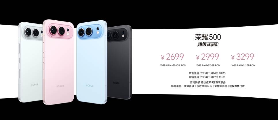 荣耀500系列共推出“海蓝宝”“星光粉”“月光银”“曜石黑”4款水晶配色,售价2699元起,现已开启预售,11月27日10:00正式开售,首销购机赠价值999元尊享服务。此外,发布会还带来全新荣耀耳夹耳机2 Pro,佩戴舒适、听感通透、交互智能,续航长达44小时,国补到手价466.65元,11月27日同步开售。