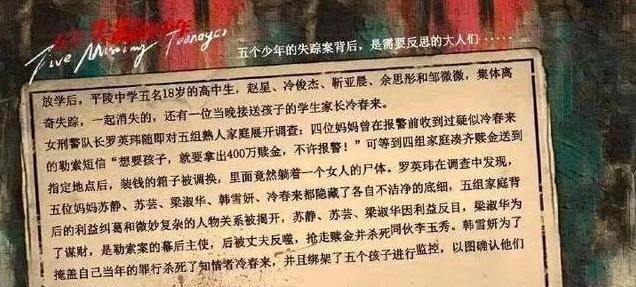 听好喽,《五个失踪的少年》是一部改编自宁航一小说的刑侦悬疑剧,这部剧讲的是五个来自不同阶层家庭的高中生,突然神秘失踪了!这就够让人揪心了吧?故事的开端是南坪中学的五名初二学生放学后神秘失踪,更复杂的是,故事中还有个母亲也一起失踪了。抱着疑问,大家肯定想知道这个母亲干嘛要牵扯进绑架案里呢?什么情况会导致一个母亲要绑架自己的孩子呢?这起事件如同一颗石子投入平静的湖面,激起了层层涟漪。