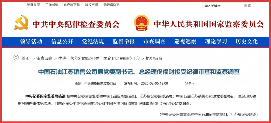 2026年2月6日,中央纪委国家监委网站发布一则重磅消息,引发能源领域广泛关注——中国石油江苏销售公司原党委副书记、总经理佟福财因涉嫌严重违纪违法,正接受中央纪委国家监委驻中国石油纪检监察组纪律审查和江苏省监委监察调查。这一消息不仅标志着又一位能源系统“关键岗位”干部跌落神坛,也再度将公众目光聚焦于国有能源企业反腐败斗争的纵深推进。