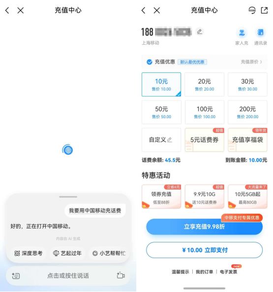而且,如果你想充话费,不用再一步步点进去,直接唤醒小艺说一声“我要用中国移动充话费”,它立马就能跳转到支付页面。看来,鸿蒙版中国移动已经和一年前不一样了,现在它应该是“中国移动(复仇版)”。