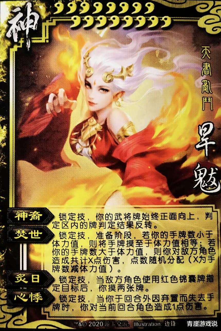 旱魃,16血量,四个技能。【焚世】是手牌小于体力值,就能摸牌至体力值,开局16张牌!如果体力值小于手牌数,则造成等量的火焰伤害。这就意味着旱魃后期强度非常逆天,避免旱魃残血高爆发,玩家必须一次性击杀她!【炙日】在其他角色使用红色锦囊后能摸牌,玩家必须少用、甚至不用红色锦囊牌。【心悸】是回合外被弃置牌时,会对玩家造成伤害,这就意味着应该对旱魃打伤害,而不是对她进行拆迁。旱魃强度非常逆天,后期更是秒杀玩家的存在!玩家必须快速击杀,否则血量根本不够她秒杀!