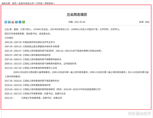 兰云同志同样有一份光鲜的履历,并不输给毛奇。他是畲族,江西弋阳人,1976年1月出生,1997年9月参加工作,拥有大学学历,而且是法学学士。兰云曾在教育科任职,之后又到监督科工作。如今他已经是万年县县委常委、县委书记和监委主任。