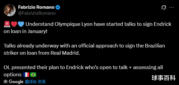 据知名转会记者罗马诺消息,法甲豪门里昂已就冬窗租借恩德里克与皇马展开谈判。这家法甲俱乐部已向皇马递交了正式的租借方案,并向球员本人介绍了球队计划与定位,恩德里克愿意继续沟通,并权衡所有选项。