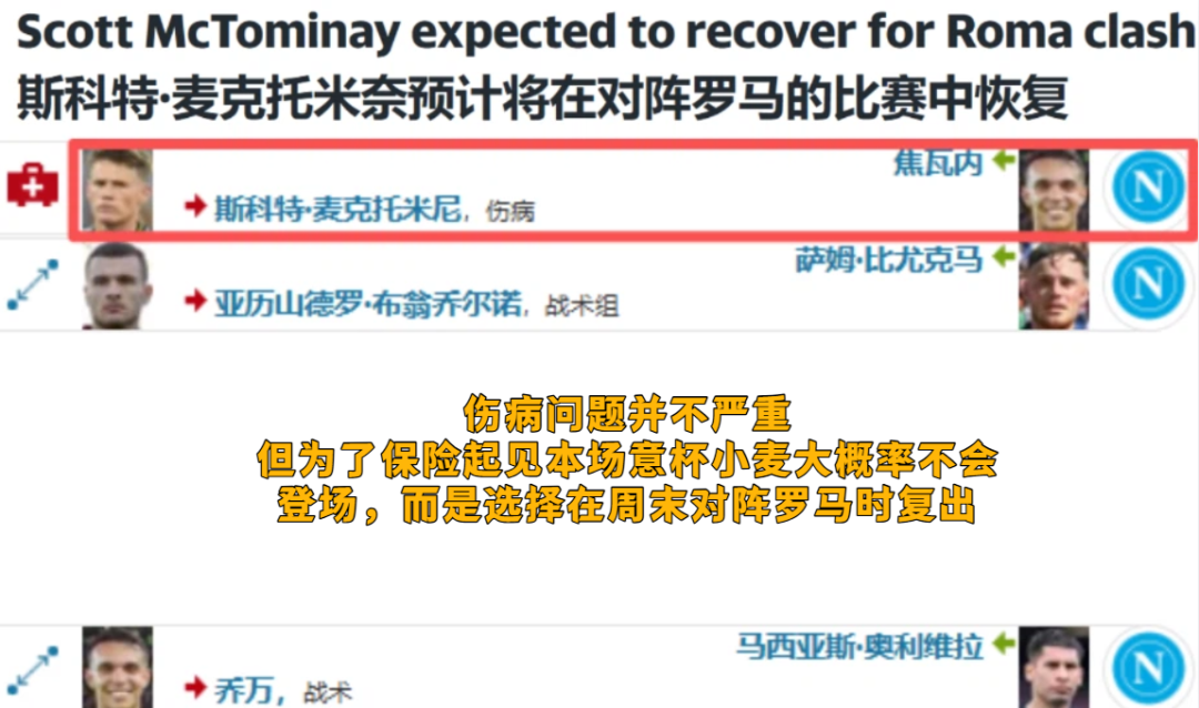 赛前最大的坏消息,无疑是那不勒斯中场核心麦克托米奈的伤缺。