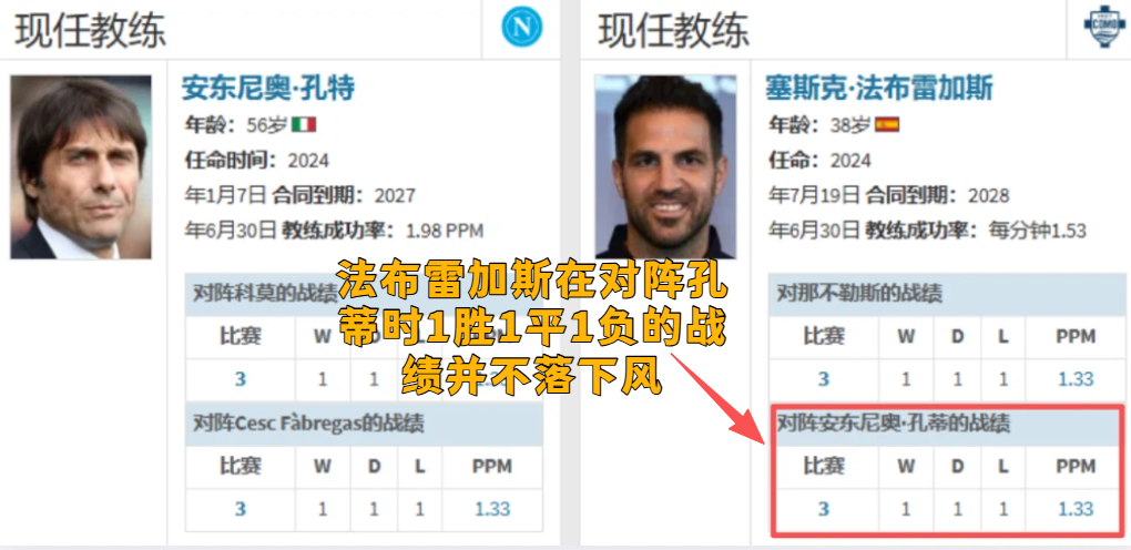 甚至法布雷加斯挂靴后开启教练生涯时,还公开表示:自己从孔蒂身上学到了太多足球哲学,一直把他当做恩师看待。但赛场之上,没有“师徒情分”,只有胜负对决。