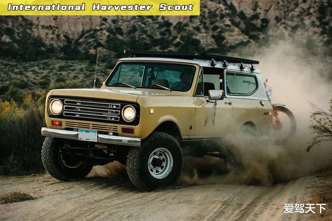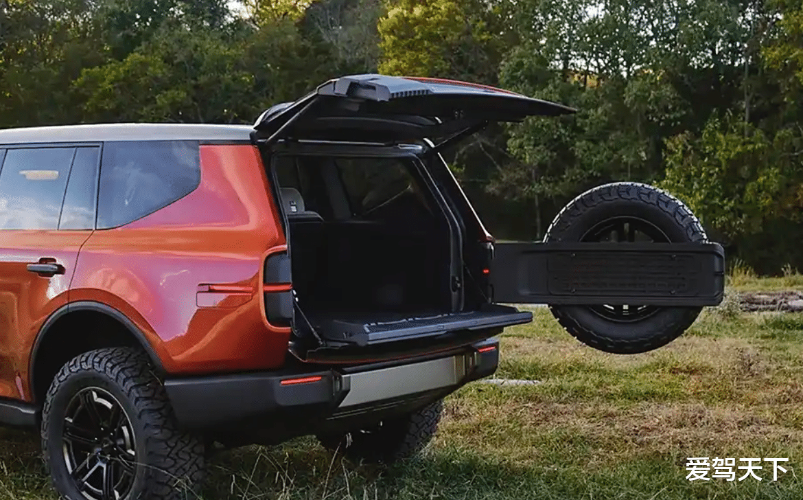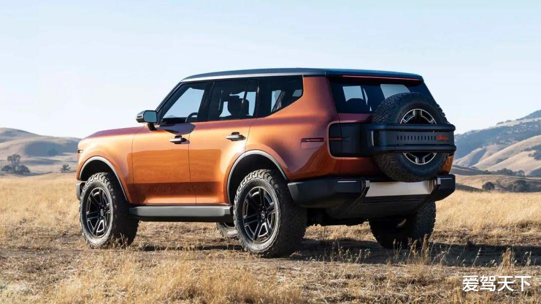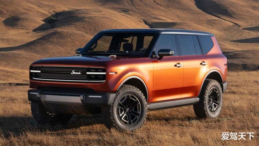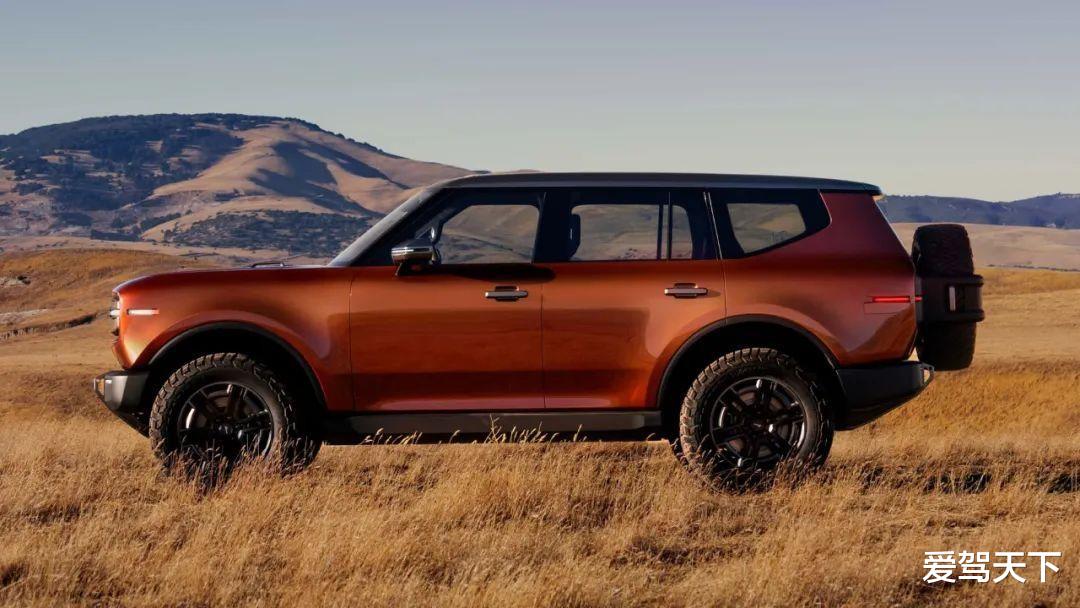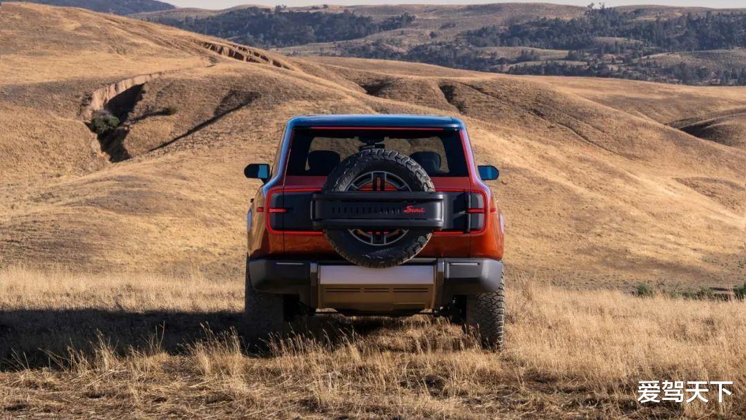 来到侧面,Scout Traveler SUV展现出饱满的车身肌肉,常见的悬浮式车顶、常规门把手,但组合在Scout Traveler SUV上,却显得格外有力量。而且,从官图可以看到车头和车尾下方两个大切角,想必一辆硬派越野所需的接近角、通过角、离去角、涉水能力以及牵引力也都配齐。车尾部分,Scout Traveler SUV提供外挂备胎,尾门为掀背式设计,满满的硬派越野气息。