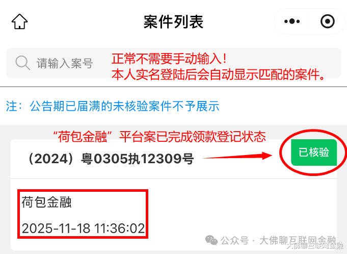 因为“荷包金融”平台上面有实际受损的人数多达278807人,所以刚出领款公告的当天,领款登记的系统有段时间还是比较拥堵的。如果登陆核验小程序后,有实际损失但却看不到对应案件的情况,可以换个时间再去,多尝试几次一般就正常了。