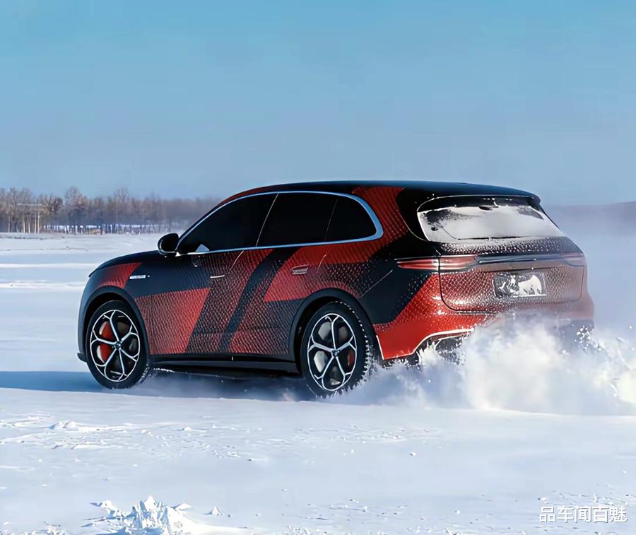 车侧一面,其侧颜虽没有相对激进的锋利腰线,但其车身整体轮廓却并不会欠缺流畅与动感元素。辅以半隐藏式门把手以及官图中显示的内置了大尺寸红色刹车卡钳的个性化轮毂,也将进一步提升其侧颜的时尚美感,并营造出性能风范。至于新车的尺寸参数,目前尚未有明显消息指出,但依照其车型定位而言,预计其尺寸编排或将介于问界M5与M7之间。