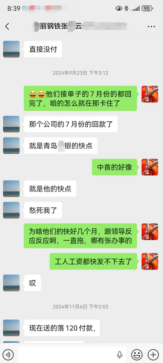 谢先生表示,在此期间,业务员曾多次承诺付款,但相关付款均未按时兑现。相关聊天记录完整还原了其持续沟通催款的过程:2024 年 3 月 27 日,张某云承诺该笔货款 “最晚后天付款”,但最终并未兑现;6 月中旬双方约定的付款日期到期后,款项拖至 6 月 19 日仍无下文,对方仅以 “再付就有你的了” 回应;9 月,谢先生发现某丽钢铁 7 月份其他货单均已完成回款,唯独自己企业的款项迟迟未结;直至 11 月,货款拖欠问题仍未解决,谢先生的企业也因资金链紧张,面临工人工资难以正常发放的问题。