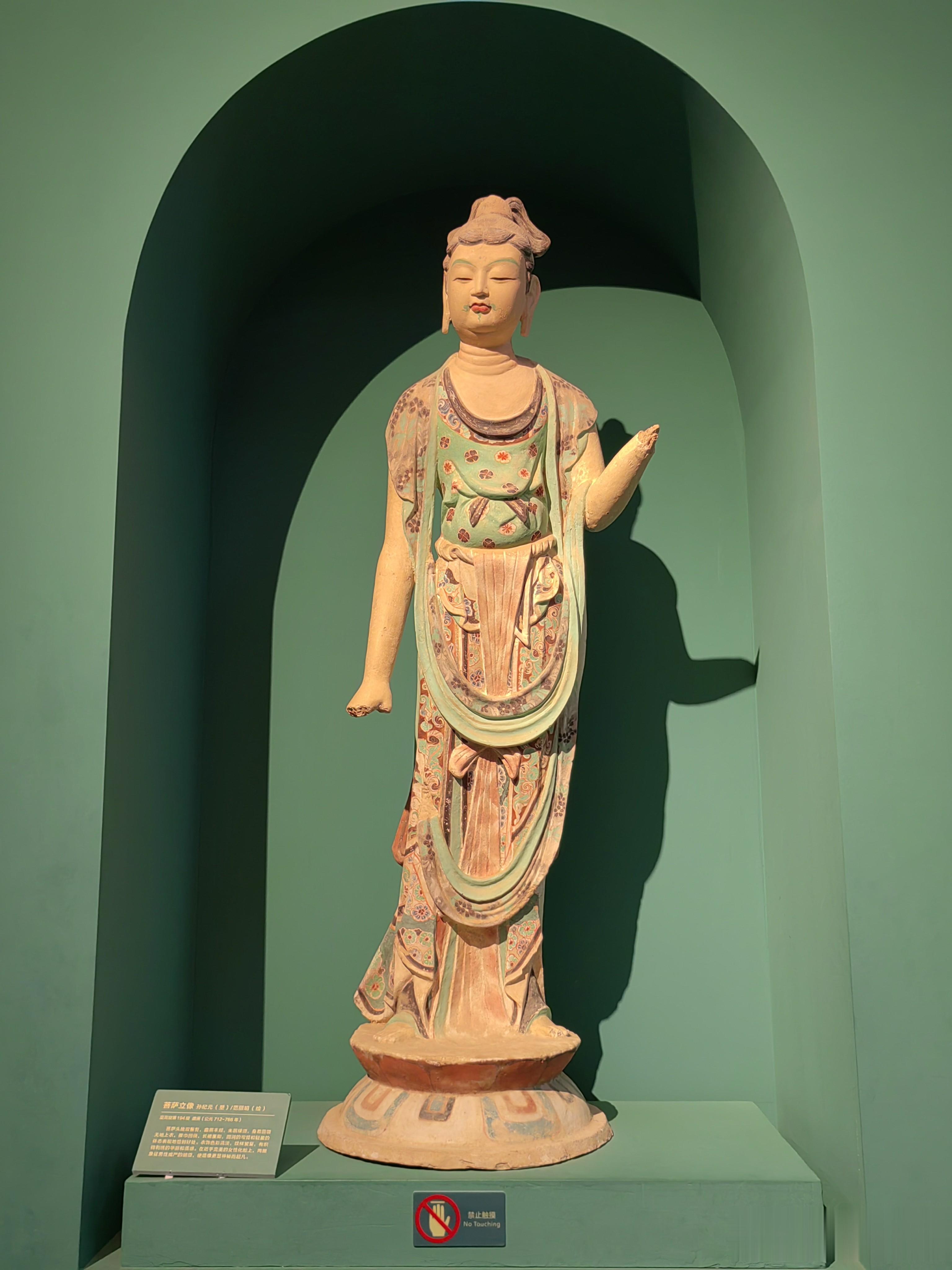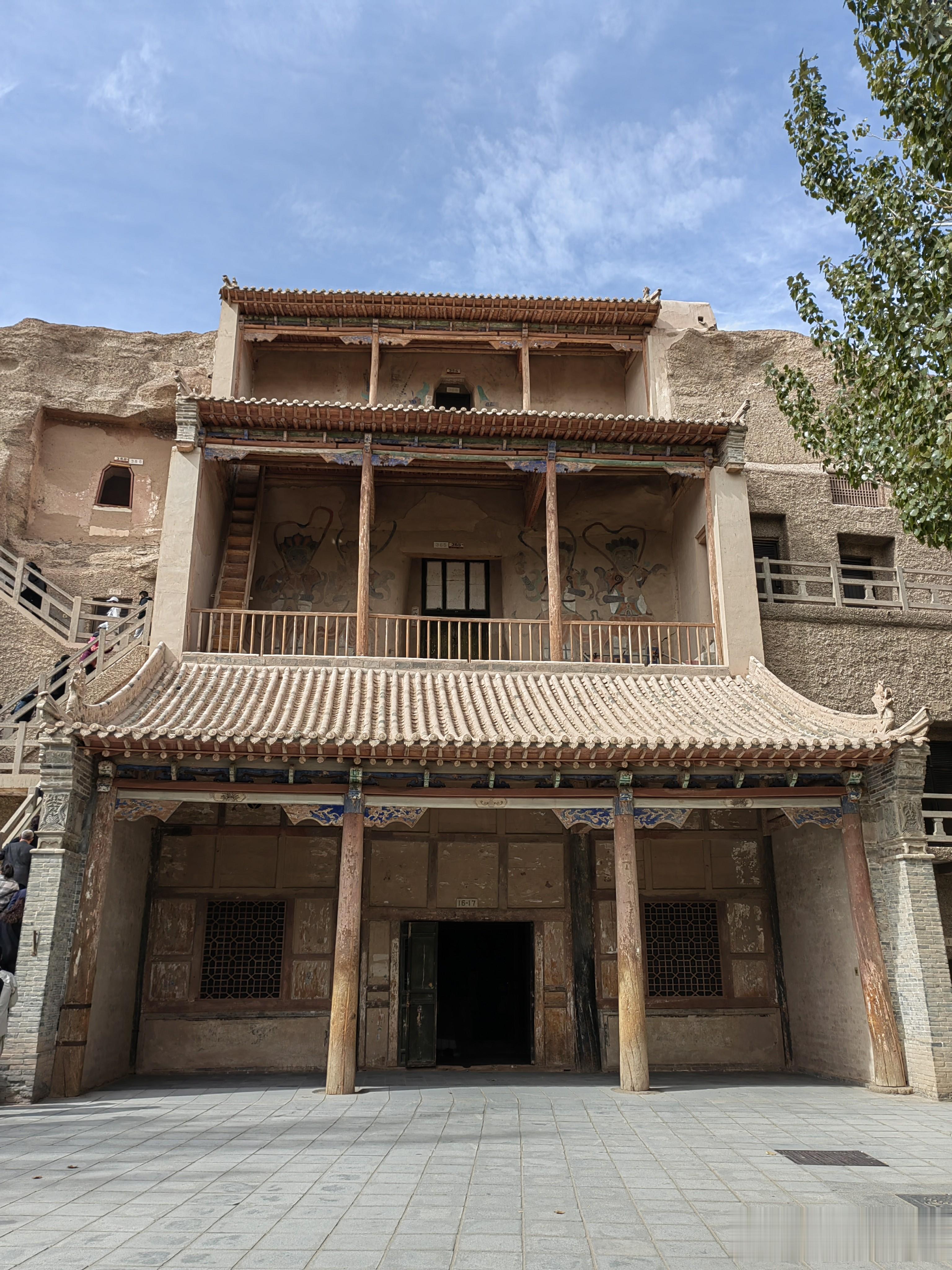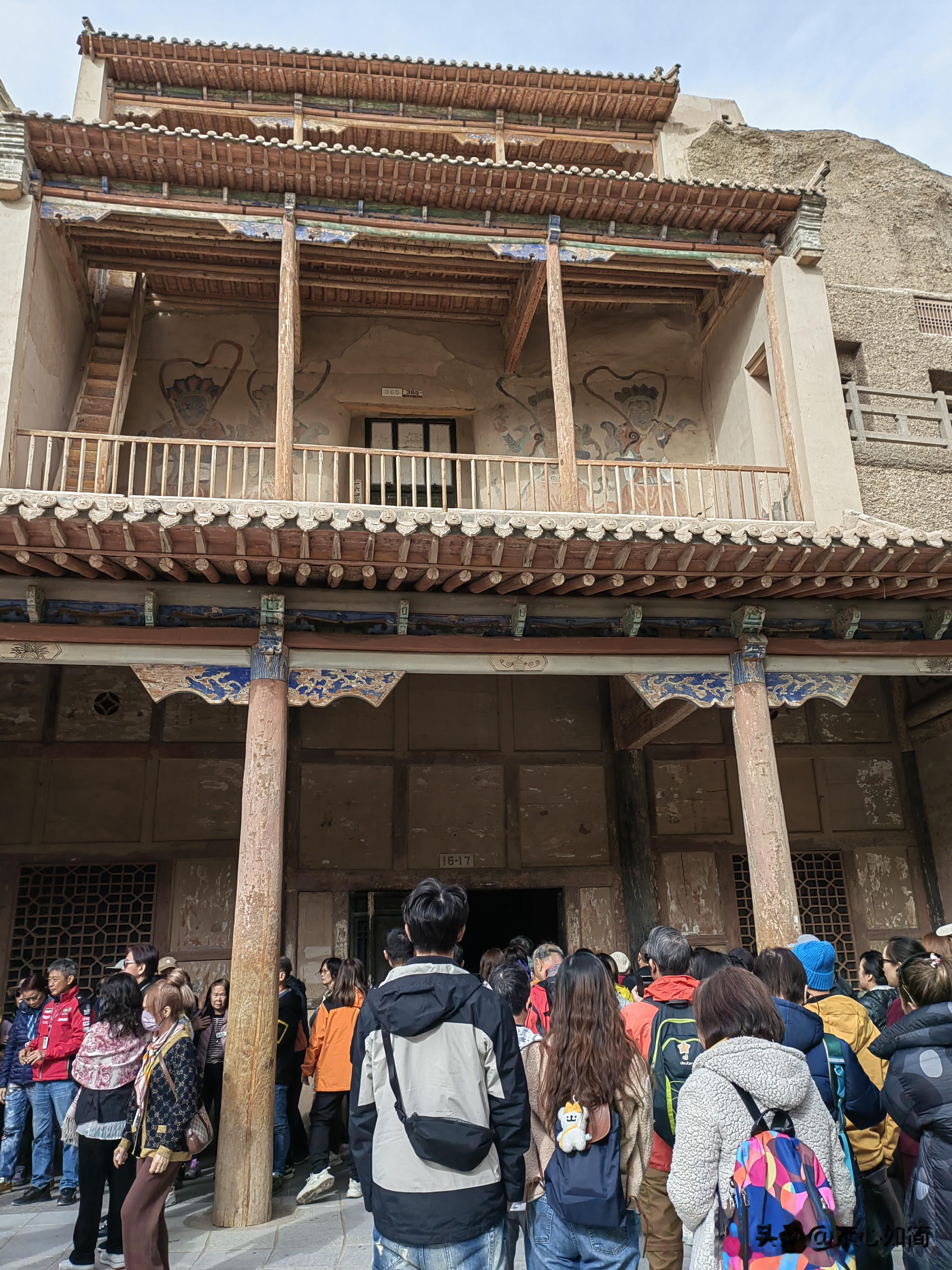 所有的游客都集中排队,然后分成小队,由景区的讲解员带着参观,买了常规票的游客一共参观八个窟,至于参观哪些洞窟是随机的,不过有两个洞窟是所有游客都能参观的,那就是17窟的藏经洞和96窟的莫高窟第一大佛,96窟也叫九层楼,是莫高窟的建筑标志,大佛像高35.5米,是莫高窟最大的佛像,也是世界上最大的室内盘腿而坐的泥胎弥勒菩萨造像之一,雕像高大威严,容纳大佛的空间上大下小,人在地面仰视会引起透视错觉,愈感佛的高大自身渺小。