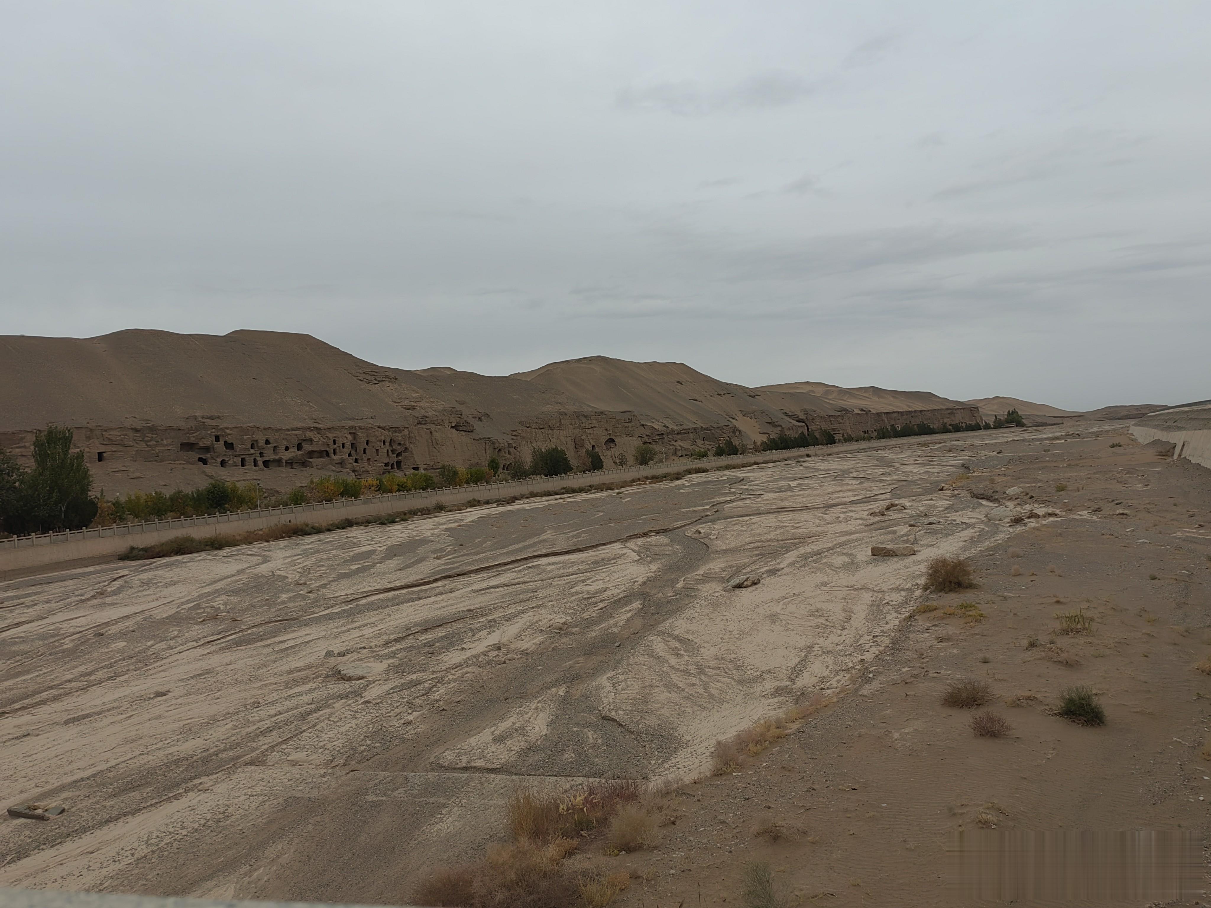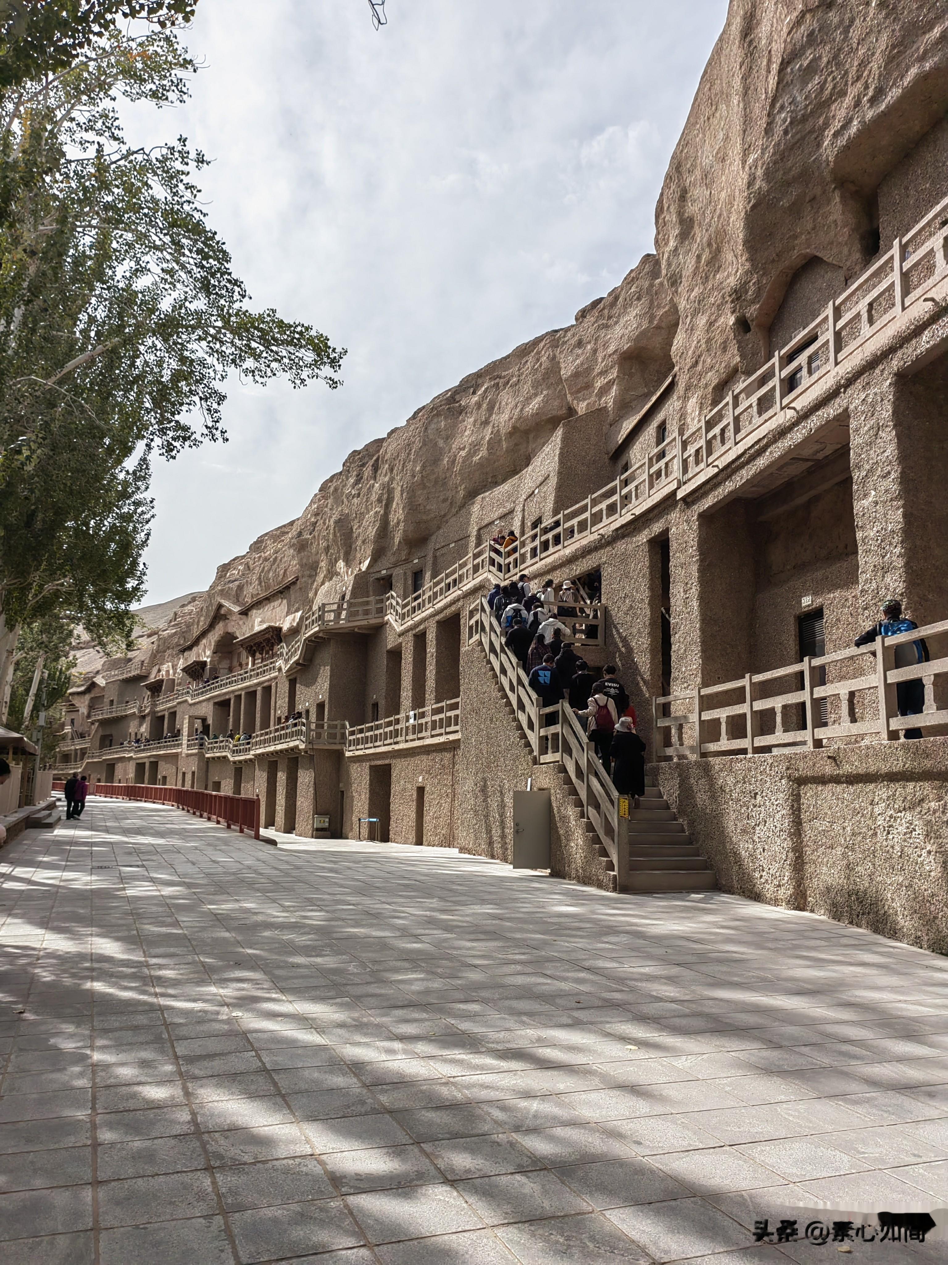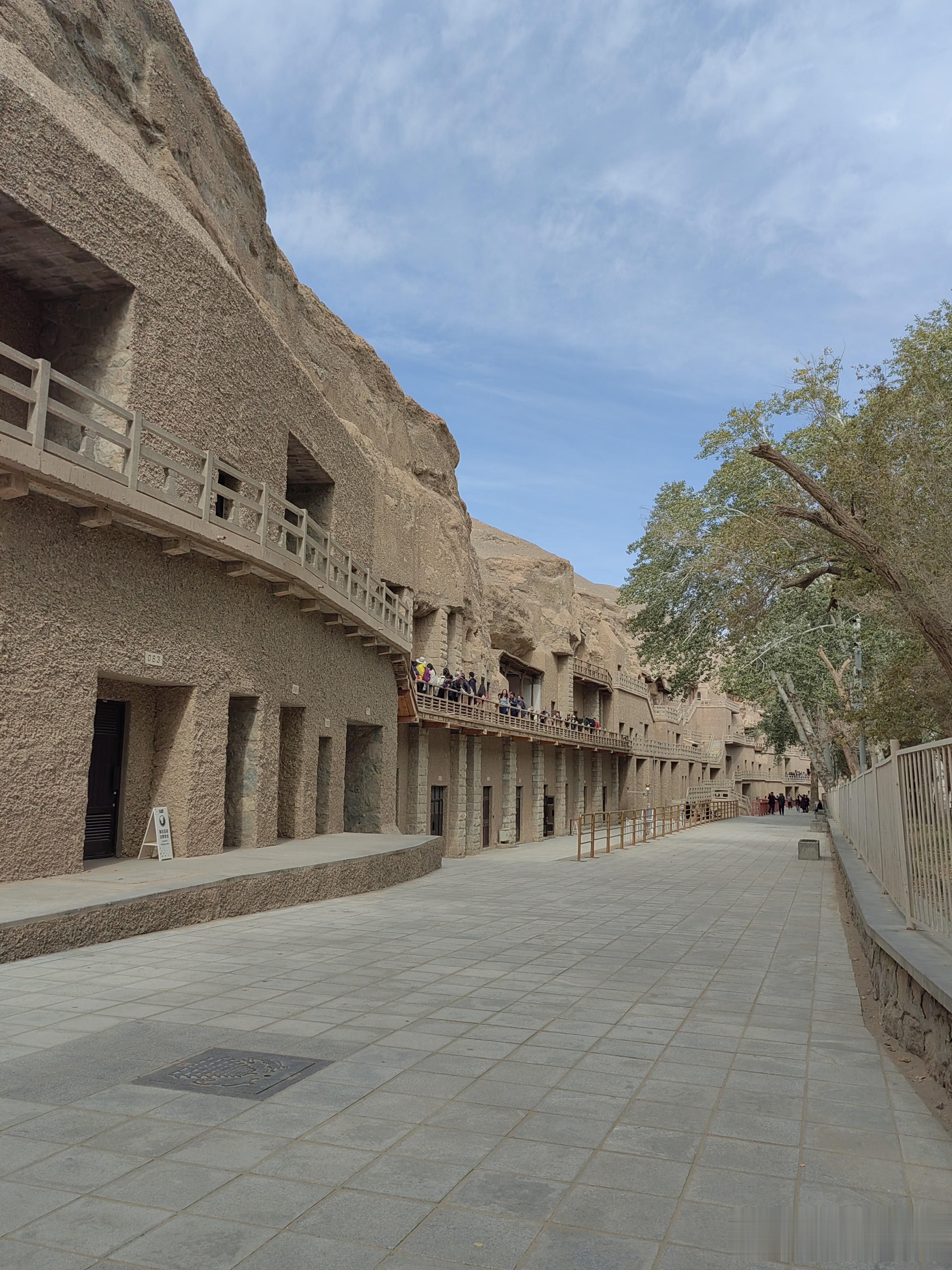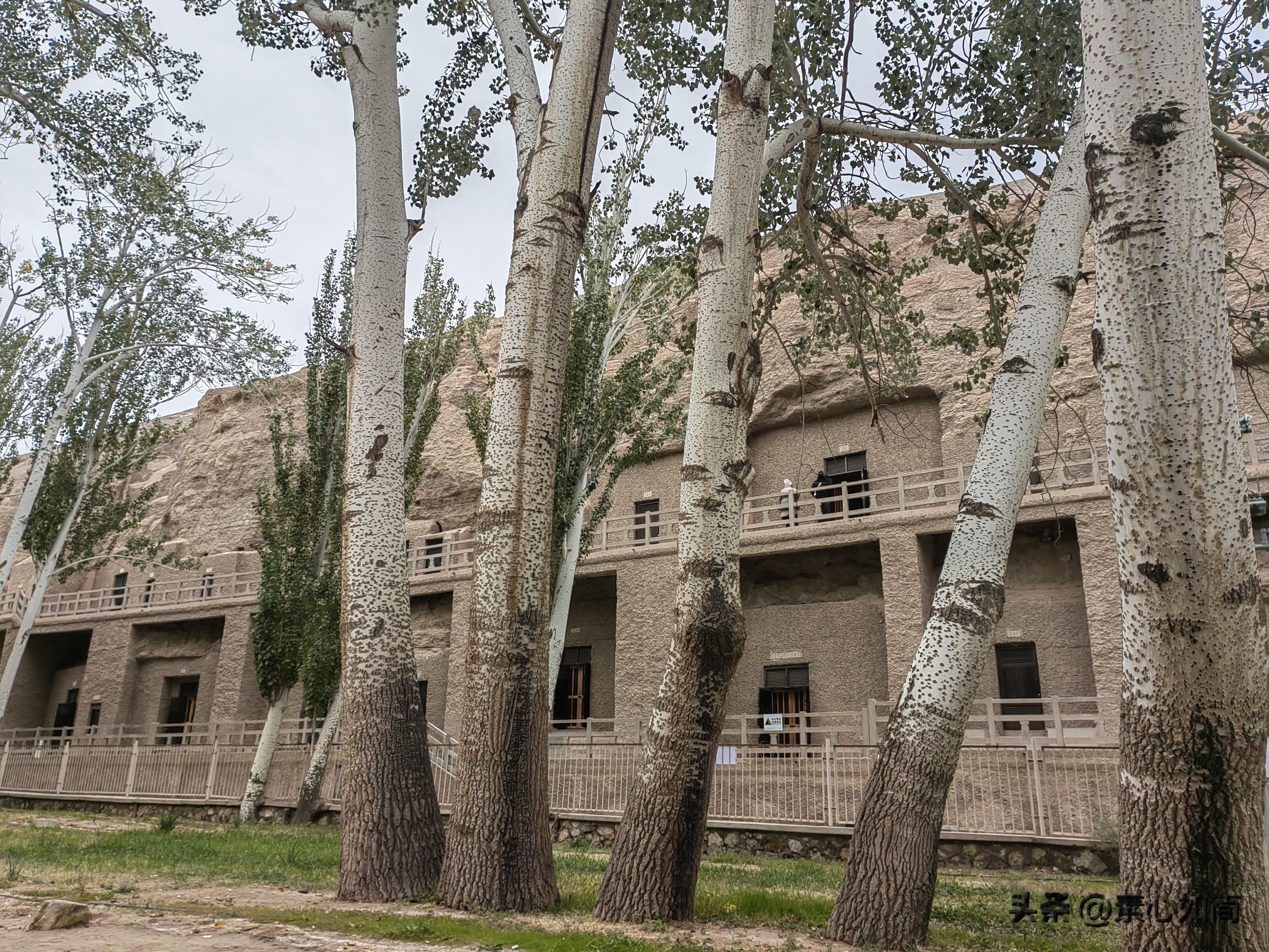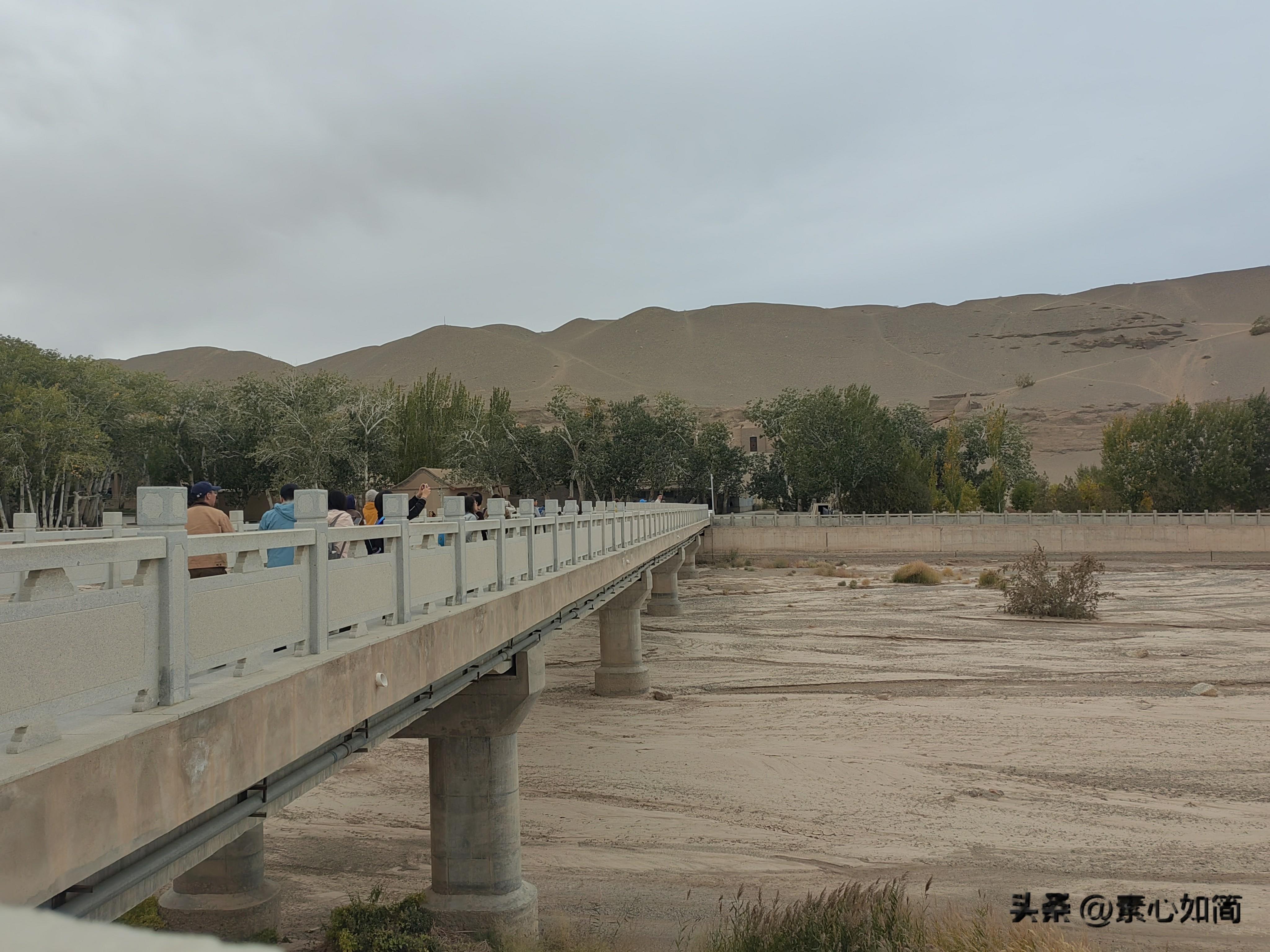 看完电影,我们坐上景区的观光车,前往17公里外的莫高窟石窟。莫高窟俗称千佛洞,位于甘肃省敦煌市东南25千米处的鸣沙山东麓断崖上。一路上除了看到有一片胡杨林外,便是一望无际的戈壁沙漠,即使是一千多年后的今天,这里也是“大漠黄沙远接天”,想不明白古人为什么会选择这么荒凉的地方建佛洞,他们日常的吃喝拉撒怎么解决?茫茫沙漠有水吗?直到观光车把我们送到一条桥边,我才解开心中的疑团。这里真有一条河,不过现在干涸,叫大泉河,这里是一片绿洲,长着很多高大的树木,有的直径粗到一两个人都抱不过来,也不知道生长了多久。