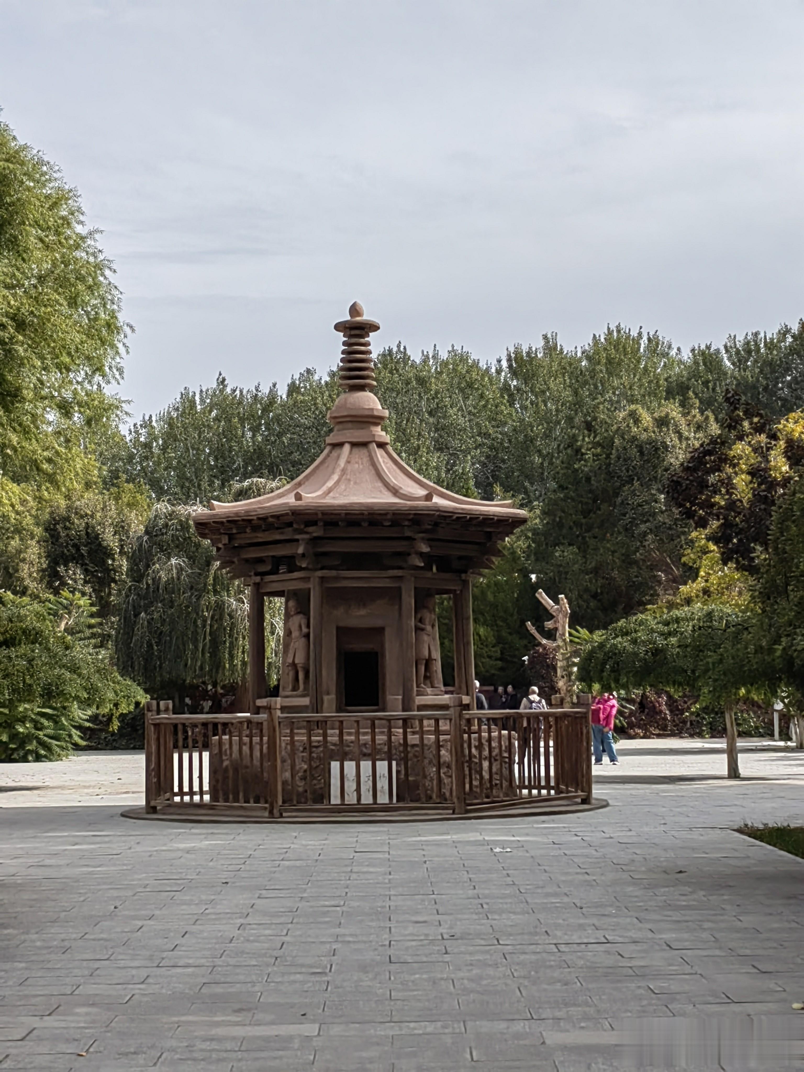 藏经洞在莫高窟的北面,它与16窟同在一座三层楼的洞窟中,藏经洞门前挤满了游客,这可能是莫高窟最热闹的地方,我们跟着人群进入洞窟,见到了位于16窟甬道北壁的藏经洞,它是一个只有两三平方的小室,中间供着洪辩高僧的塑像,这个位置确实很隐秘,封上门就是一面墙壁,难怪九百多年没人发现。文物的流失,大家都怪罪王圆箓,他的功过至今仍被学界争论,但不可否认的是,没有他,藏经洞或许仍深埋沙中,莫高窟也不会这么快扬名世界。你可能会说没有王道士,或许会有李道士,张道士等等发现藏经洞,问题不是谁发现藏经洞,而是发现了藏经洞,清政府却没有引起重视,才导致大量珍贵文物流失。据介绍王道士虽然贱卖了一些文物,但他自己并未花一分一厘。这些银两都用在莫高窟的维护上,他既是莫高窟的守护者,也是文物流失的经手人,所谓“成也萧何,败也萧何”。在莫高窟的停车场旁,还有一座王圆簶塔,算是后人给这位发现藏经洞道士的纪念吧。我想如果是现代发现藏经洞,文物一定不会流失国外,只是历史没有如果,只有结果。