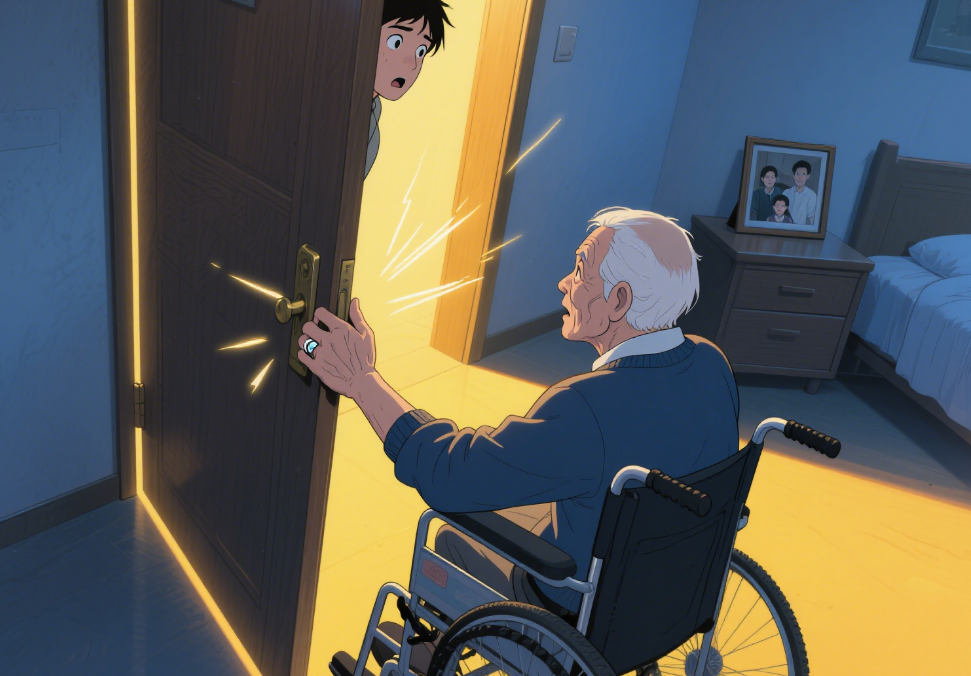 父亲被这巨大的声响彻底惊吓到了,他猛地缩起脖子,喉咙里的“嗬嗬”声变成了惊恐的呜咽,浑浊的眼睛里充满了孩童般的无助和恐惧,枯瘦的身体在轮椅上瑟瑟发抖。