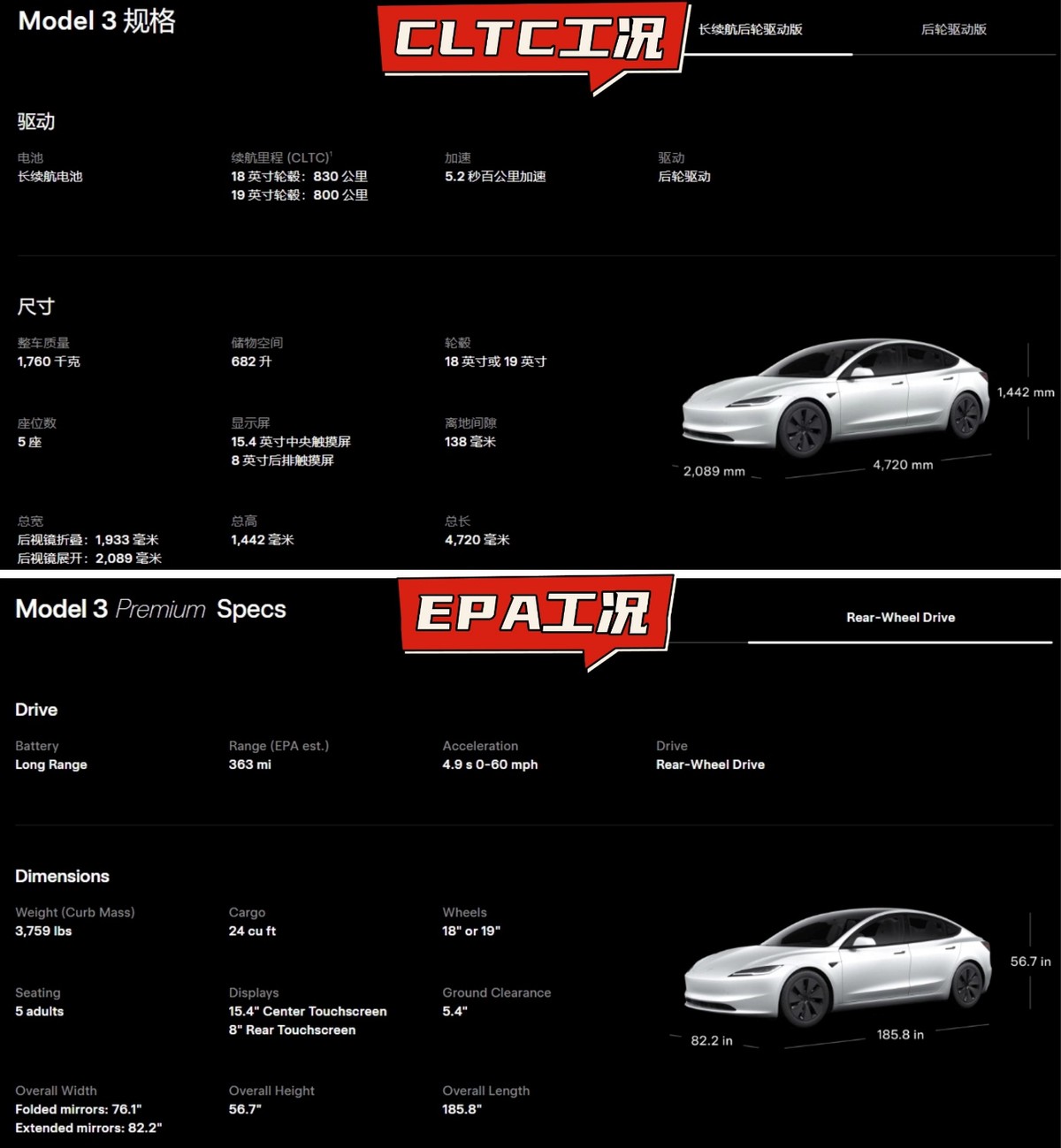 美规车的能耗测试工况(EPA工况)全球最严,更能反映真实用车的能耗水平,而中规车的用电部分采用的CLTC循环纯属欢乐表。比如同样80度电池的Model 3后驱版,中国版续航800公里,美国版续航只有584公里,足足37%的差距。