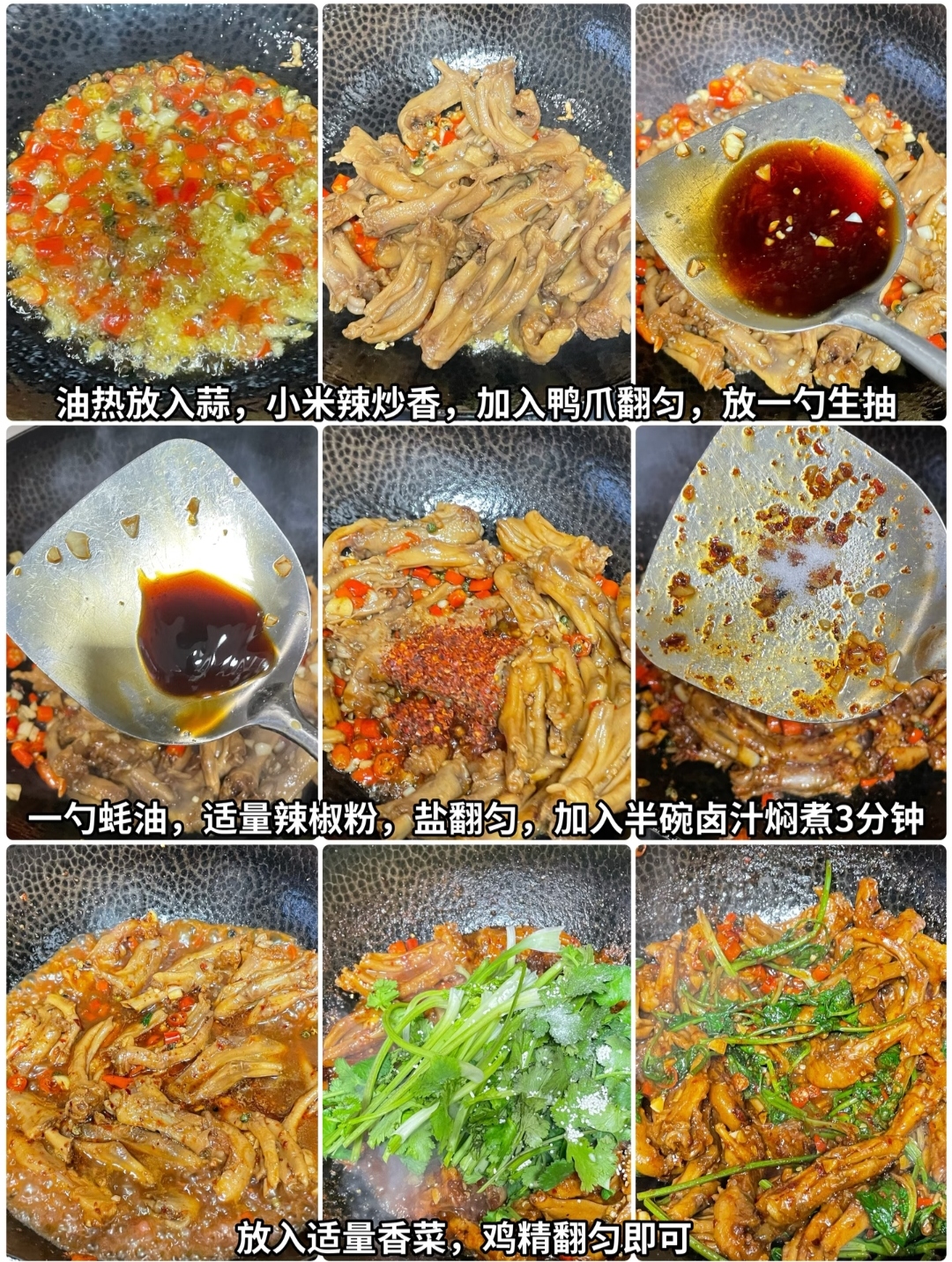 5. 火候要灵活:蒜和小米辣小火炒香,鸭爪转中火,最后收汁大火,这样香味不糊,口感最佳。