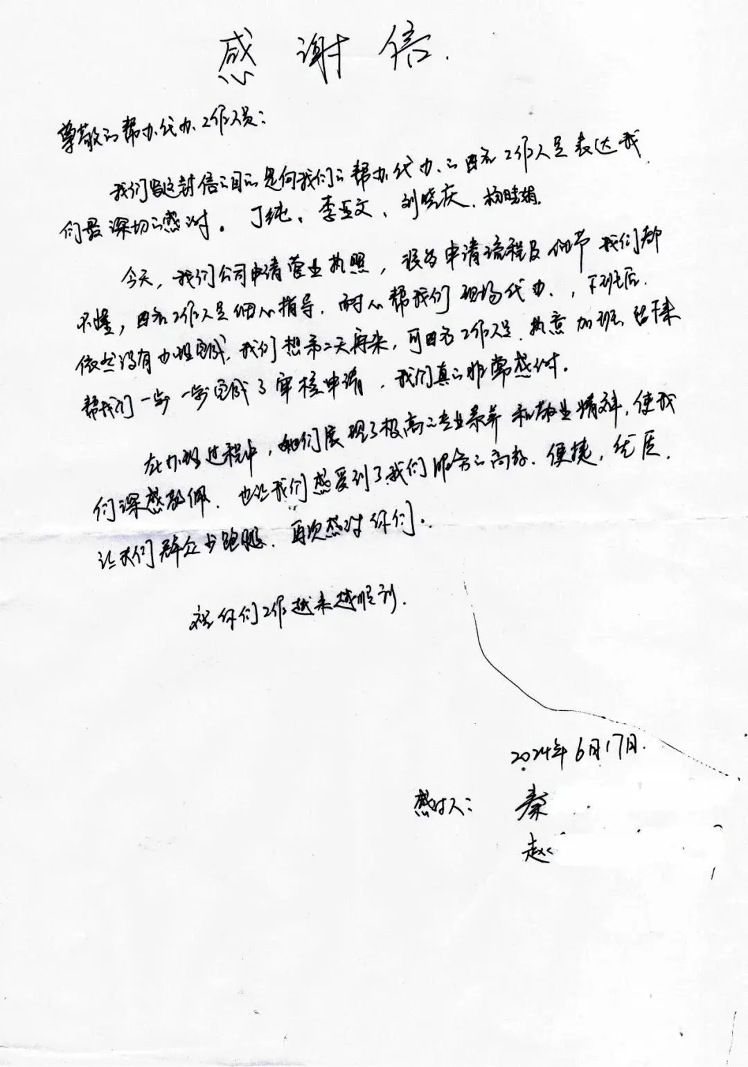 “今天我来办理公司的注册手续,帮代办员非常耐心地给我答疑解惑,还提供帮办服务,帮我节省了很多时间和精力,非常感谢!”办理完成后,秦女士和赵女士激动不已,现场写下一封感谢信。