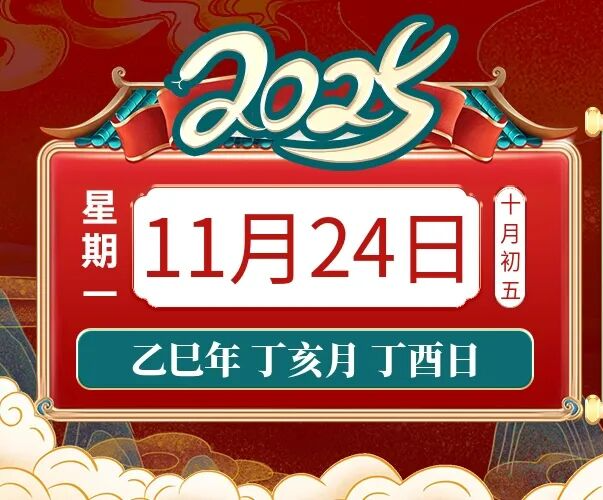 2025年11月24日,星期一,农历十月初五 (乙巳年丁亥月丁酉日),法定工作日。