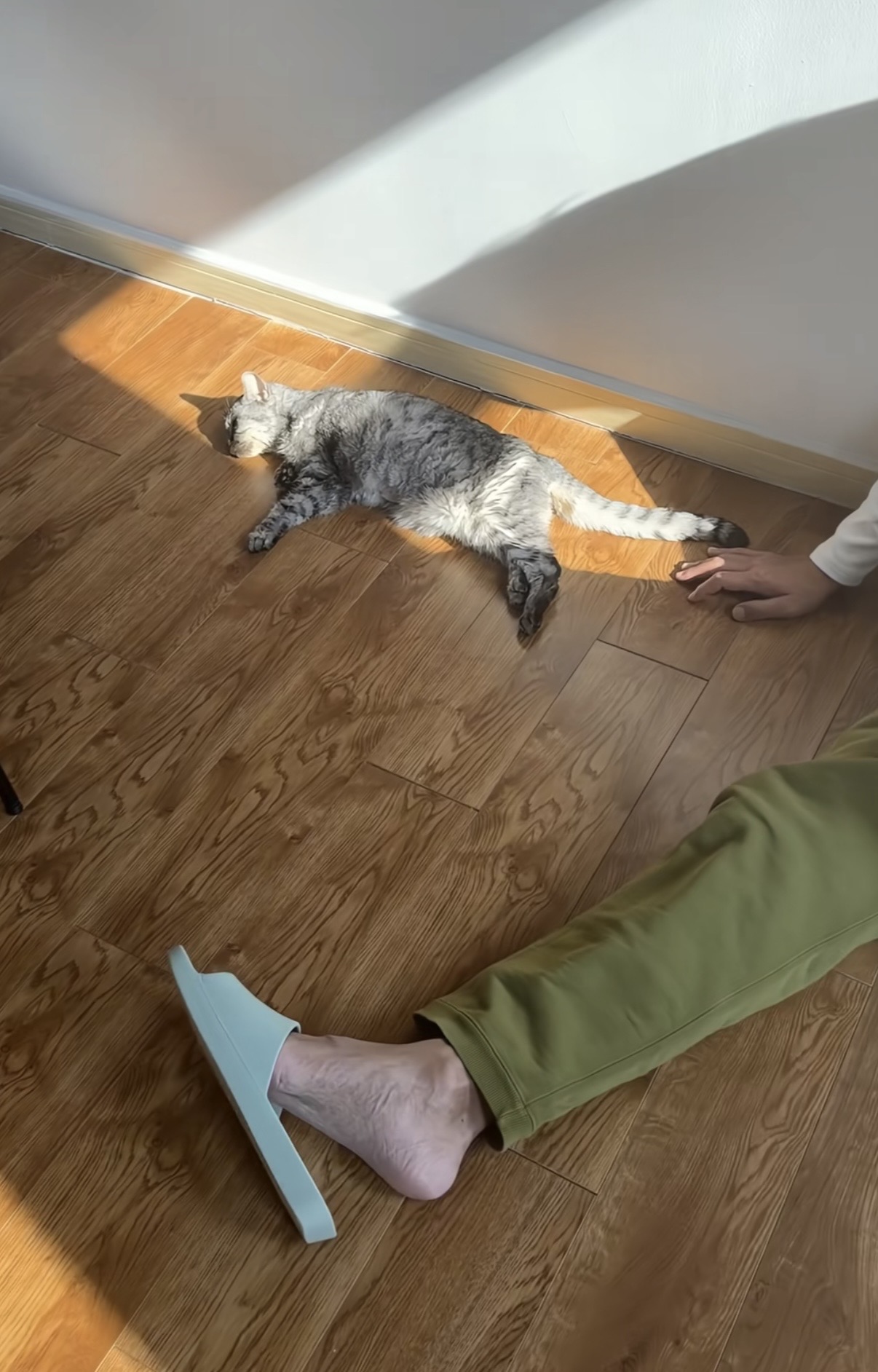 王冠还晒出了老公陪伴小喵的画面,这是一只黑白色的小喵,它躺在地板上晒太阳的模样很慵懒,看着软绵绵的。李先生用手指抚摸他的头,小喵乖乖的、一动不动。