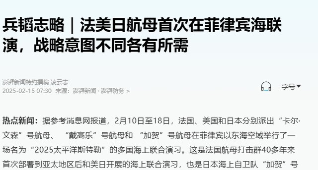 最近的海上,可是热闹非凡,先有美国、法国以及日本三国决定要在菲律宾海展开一场联合军事演习,后有我国派出七艘实力强大的战舰通过宫古海峡进入西太活动。
