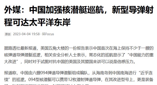 此前有报道称,美国还发现中国派了潜艇在南海进行常态化巡逻,而五角大楼方则一口咬定中方派了整整6艘094核潜艇轮值在南海巡航,并且094型核潜艇可以携带12枚潜射弹道导弹,并且据报道装备的一种新型导弹,射程可以超过上万公里,这样的巡航新模式,让美方如临大敌。
