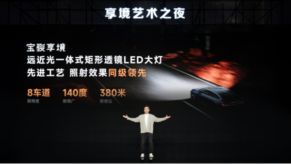 宝骏享境配备的远近光一体式矩形透镜LED大灯,照得更宽、更远、更亮。照射角度高达140度,可照亮8车道,远光最远照射距离大于380米,接近4个足球场的长度总和。