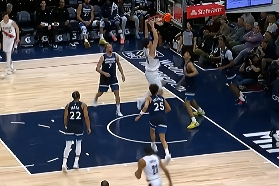 虽然被裁判盯得紧,但小杨并不是毫无贡献。接下来一个防守回合,森林狼想给内线传空中接力,小杨在沉退防守的过程中,死死盯住后卫起球的时间,然后准确判断了皮球的最高点,将传球扇飞,一个飞断直接帮助开拓者打出一波反击。而在比赛最后时刻,开拓者后卫顶着2人上篮不进,杨瀚森跟进非常积极,直接起飞完成一个双手补扣,全场欢呼,队友韦斯利更是挥拳庆祝,场边的斯普利特也拍手称赞,这一球非常精彩。