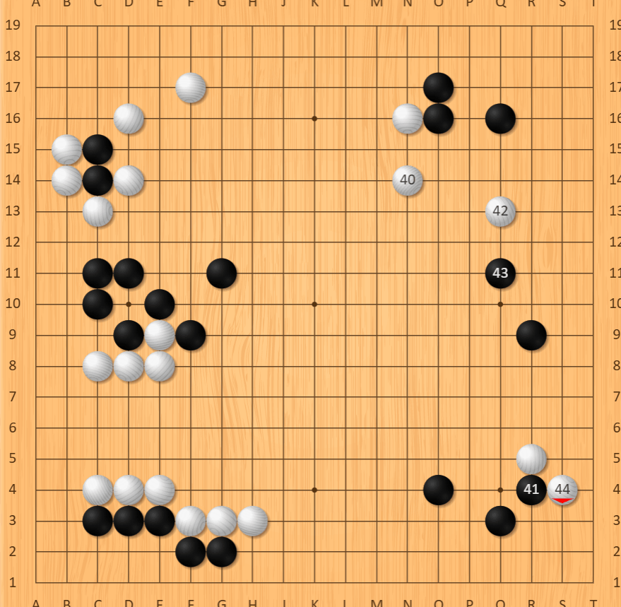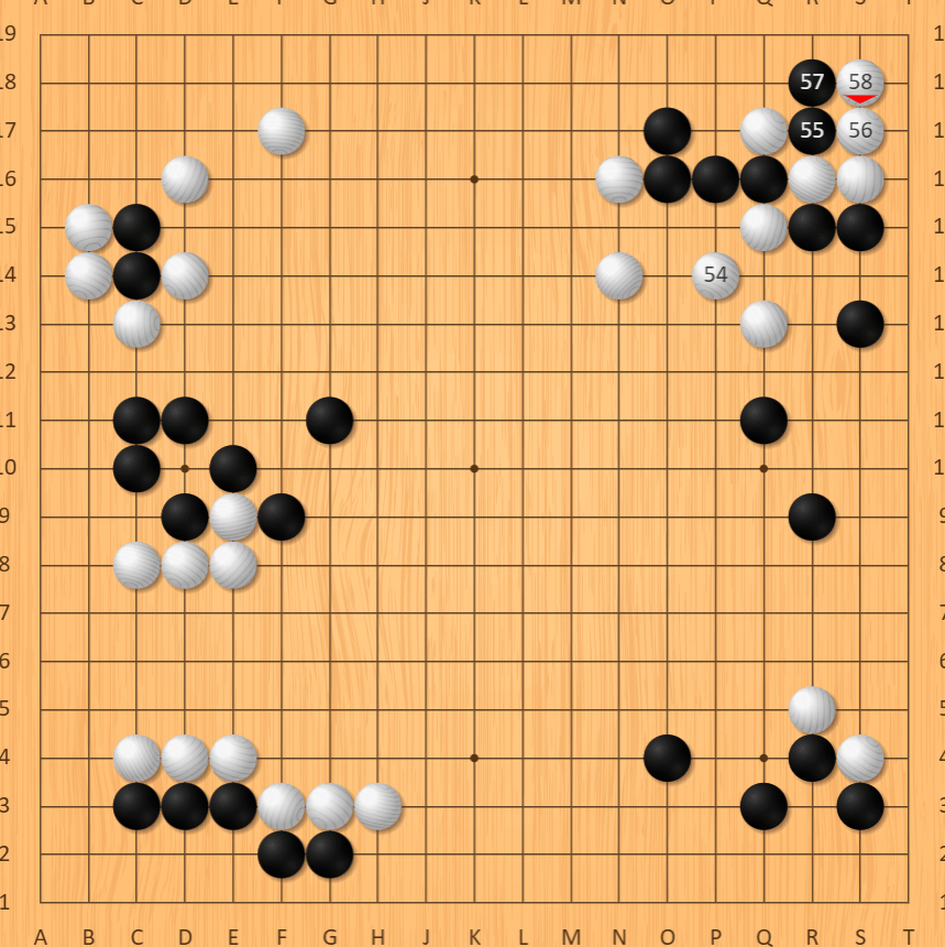 随后申真谞在右上40手脱先犯下缓手,王星昊果断抓住漏洞,先在右下吃角巩固实地,再转战右上与白棋缠斗。54手时,申真谞仍执着于经营外势,导致右上角落被王星昊成功抢占,黑棋胜率一举攀升至70%。