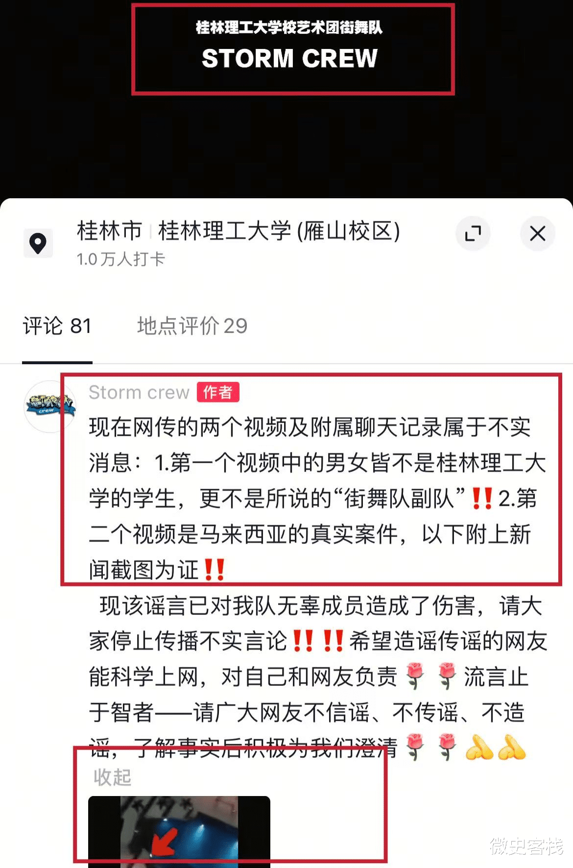 另外,桂林理工大学街舞社“Storm crew”也在其社交平台的置顶视频评论此事,称两个视频及附属聊天记录属于不实消息。