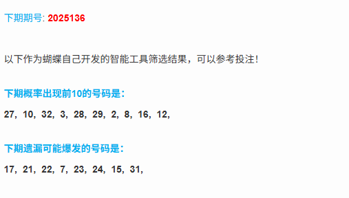 本期文章开始,蝴蝶要分享的规律,仍旧是一组组合号码,可以考虑一下08,12,13和32,本期可以考虑1个号码。
