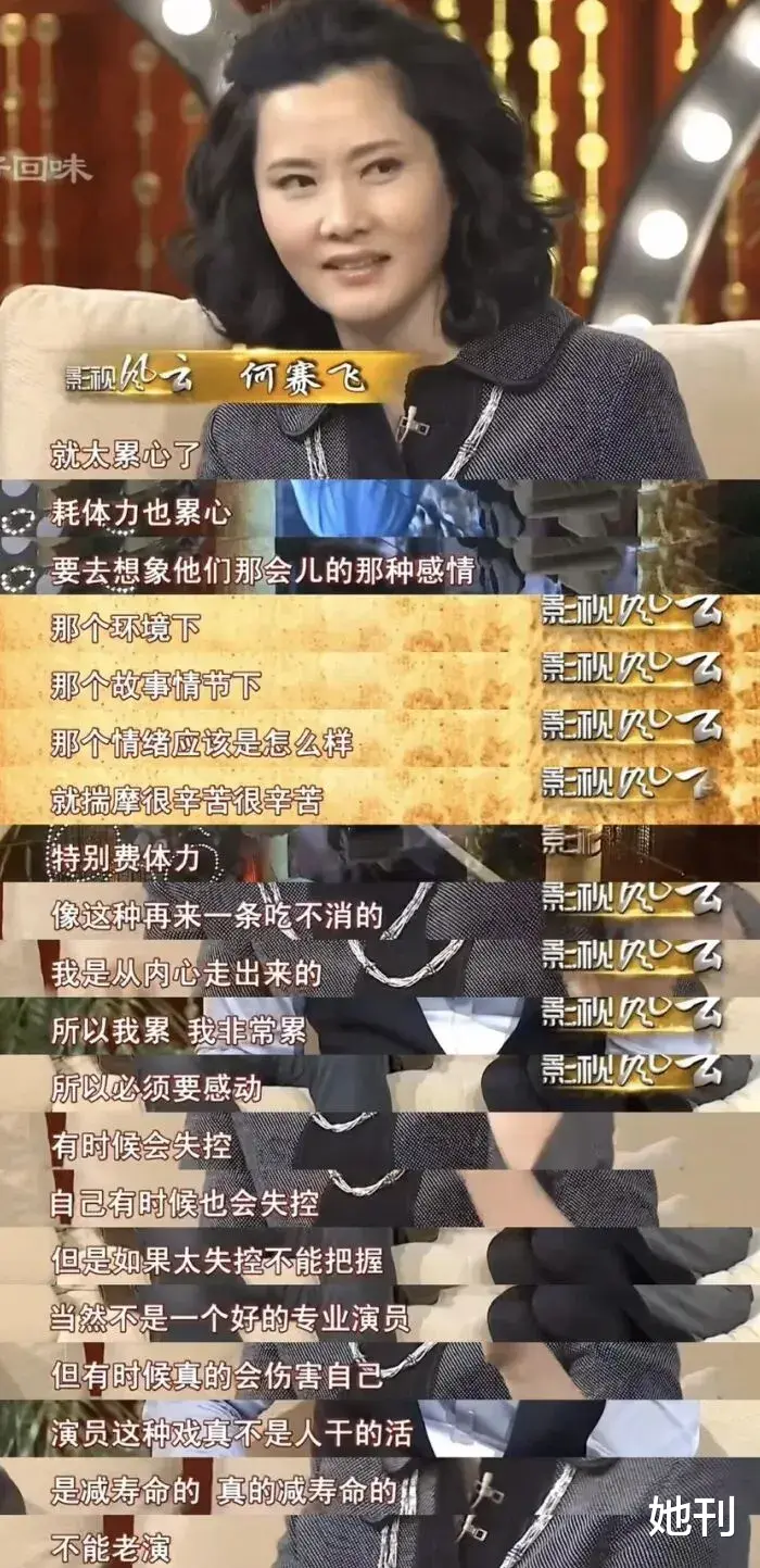 这种“灵魂附体”般的演戏方式,让何赛飞多次感慨,做演员太累心了,要折寿的,这是生命的折旧。
