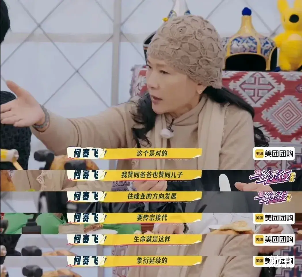 在与当地牧民一家的聚餐中,面对催婚的父亲,几位姐姐都站在儿子的角度说话,只有何赛飞坚定地支持父亲,主张人类就是要传宗接代。