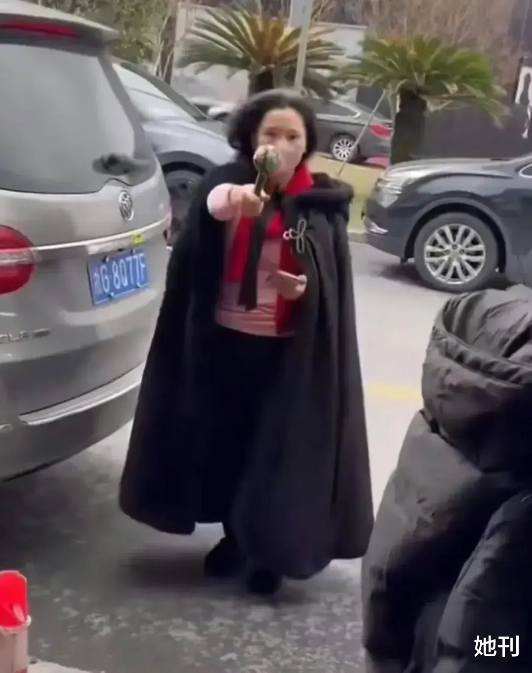 她身披黑斗篷戏服,手持艾草锤,一路愤怒地追着横店代拍大喊:“手机给我!谁叫你拍的?神经病!”逼得代拍落荒而逃。