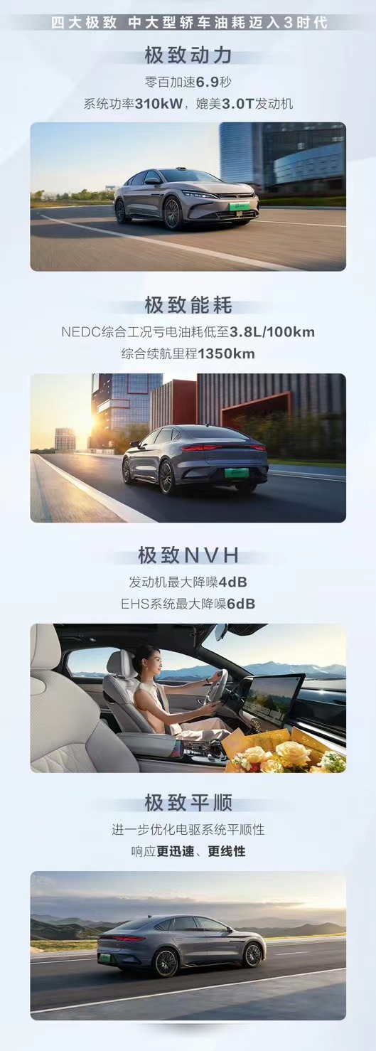 技术上,25款汉更是向极致进化。汉DM-1搭载第五代DM技术,采用插混专用1.5Ti高效发动机+EHS 的黄金动力组合,带来四大极致表现。极致动力,提供媲美3.0T发动机的强悍动力,零百加速6.9s。极致能耗,亏电油耗低至3.8L,综合续航高达1350km,开启大中型轿车油耗3时代。极致NVH,发动机最大降噪4dB,EHS最大降噪6dB,更有不输传电动车的极致平顺表现。