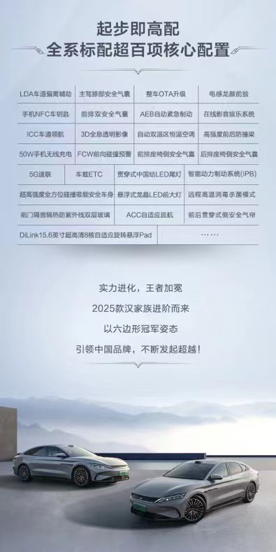 9月9日,比亚迪王朝旗舰轿车汉家族推出2025款,携美学、智能、技术、驾控四大进化全面升级而来,六边形冠军实力再度进阶,打造最强旗舰轿车。其中汉DM-i全系标配第五代DM技术,汉EV搭载 DiPilot300“天眼之神”高阶智驾系统,实力成就最强黄金组合。