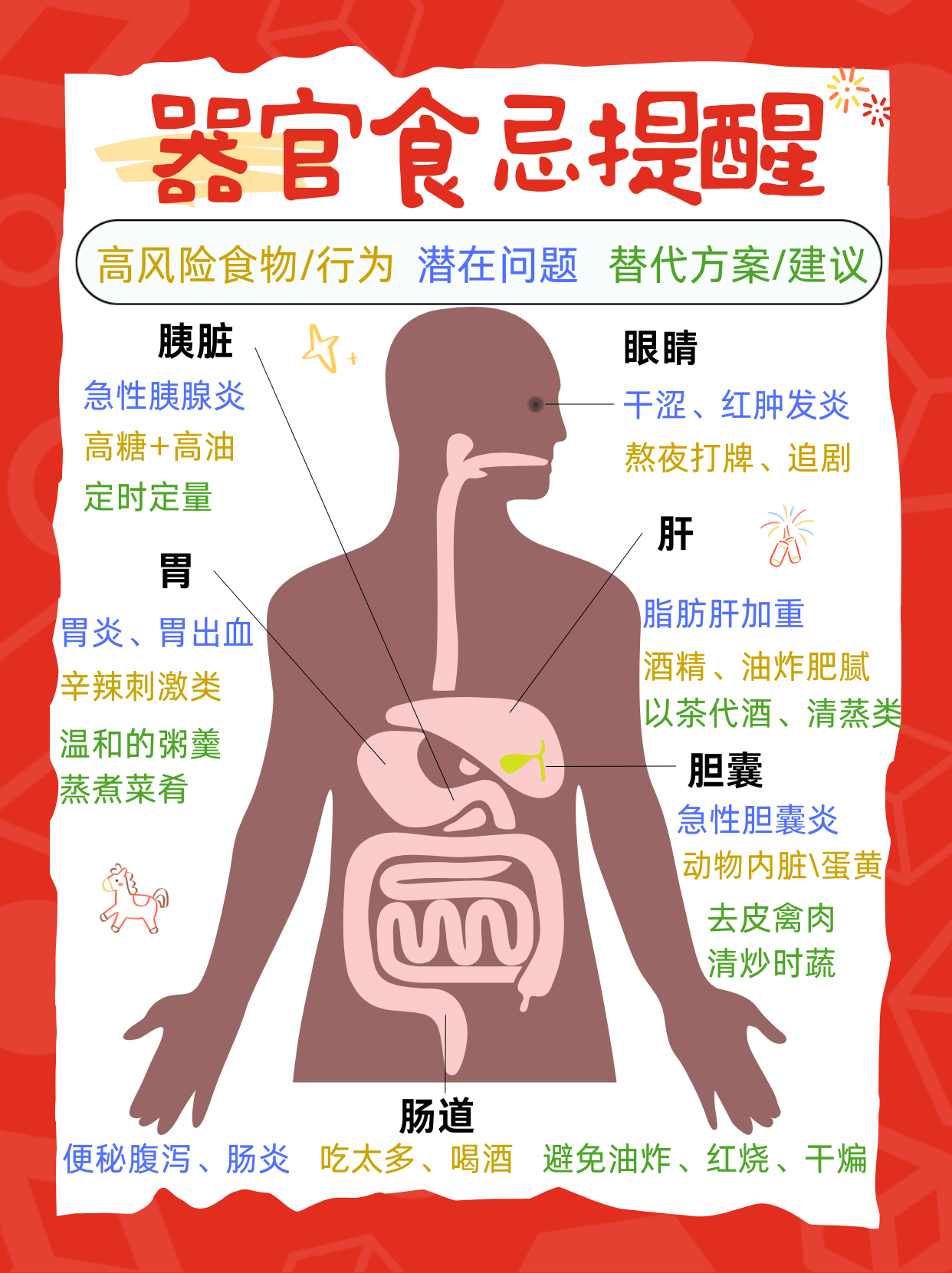 在欢庆之余,哪个器官可能因为哪些食物而出现哪些问题。